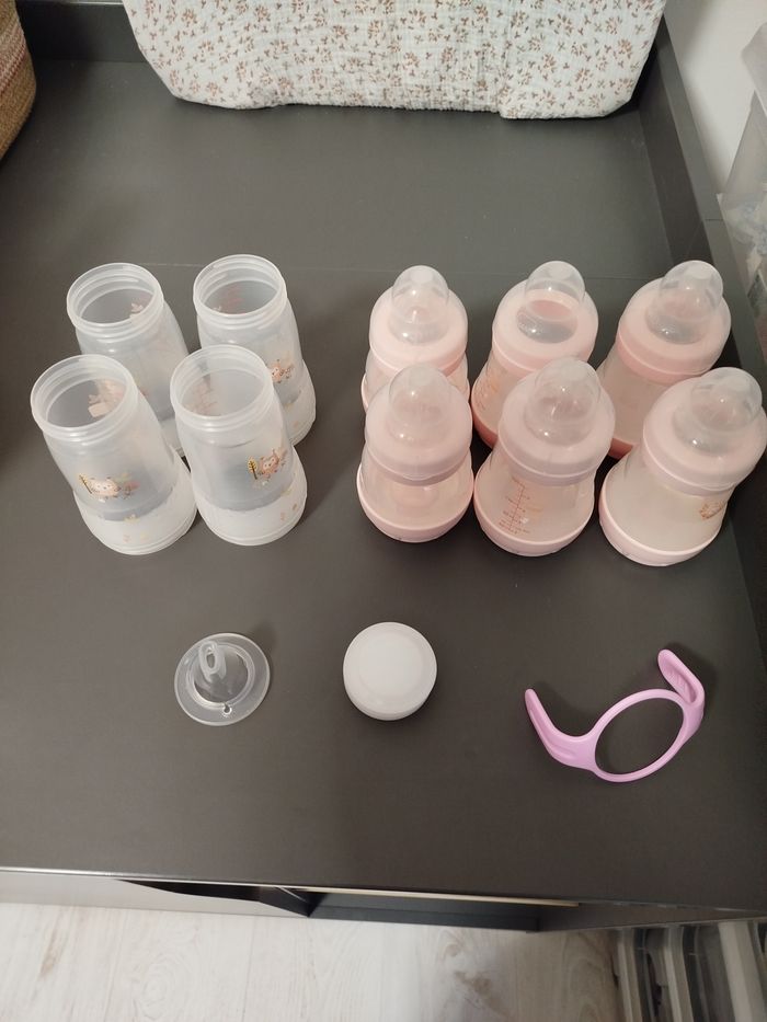 Très bon état, très peu utilisé, ma fille n'a pas voulu boire avec 2 corps de biberons 130ml 4 corps de biberons 160ml 4 corps de biberons 260ml 6 bagues de biberons + capuchons 6 socles avec valves 1 bec anti fuite neuf, jamais servi 1 anse 4 disques d'étanchéité. Manque seulement la tétine et les tétines de biberons car utilisés.