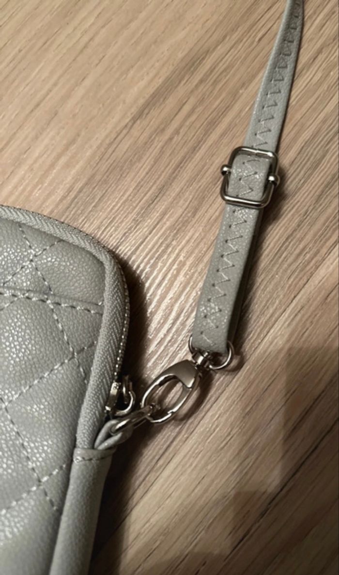 Petite pochette grise clair extérieur et noire intérieur Dimension: 18 x 12 x 3 cm Poche principale qui se ferme avec une fermeture éclair Une petite poche à l’intérieur Une poche extérieur qui se ferme avec une pression