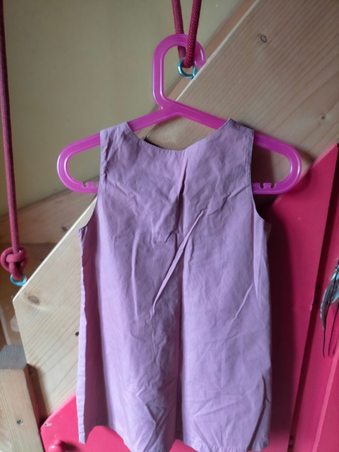 Excellent état. Jolie robe sans manche en cotonnade vieux rose avec plastron très travaillé, volant, boutons recouverts et broderies. Très élégante
