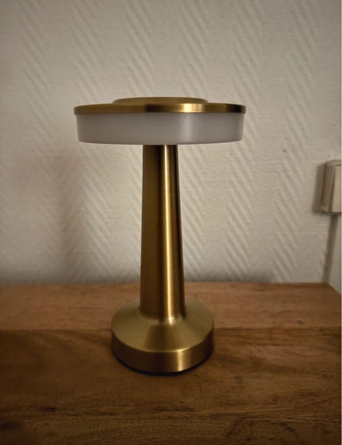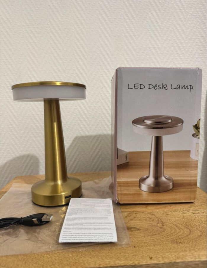 Superbe lampe LED rechargeable, couleur or. Design vintage, parfaite pour le salon, la chambre ou le bureau. Eclairage ajustable (plusieurs intensités) Batterie rechargeable via USB (câble inclus) Compacte, légère et facile à déplacer Neuve Plusieurs mode d'éclairage qui se change en tapotant sur le dessus de la lampe Idéale pour créer une ambiance chaleureuse et chic! Taille: 25cm * 14 cm