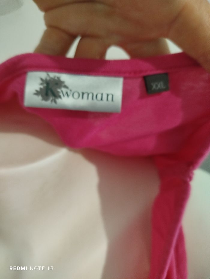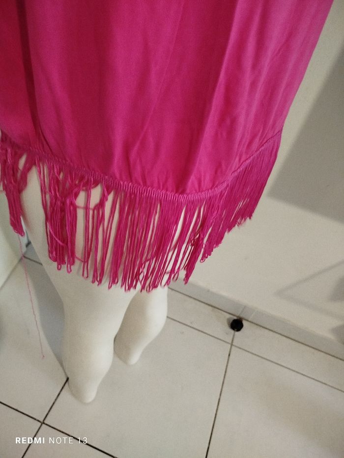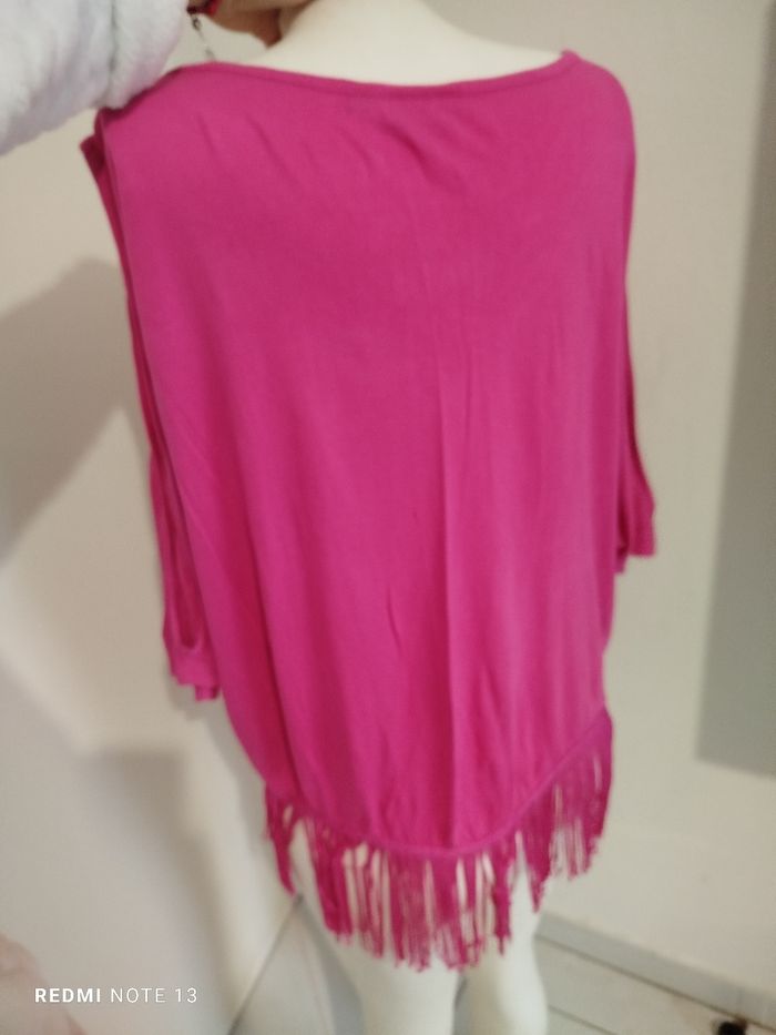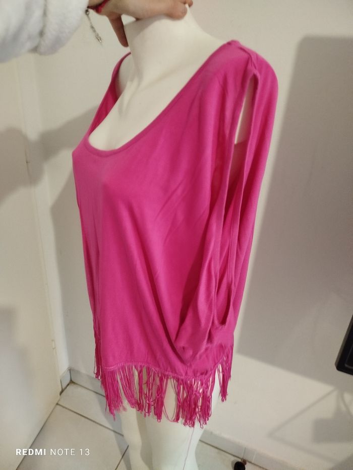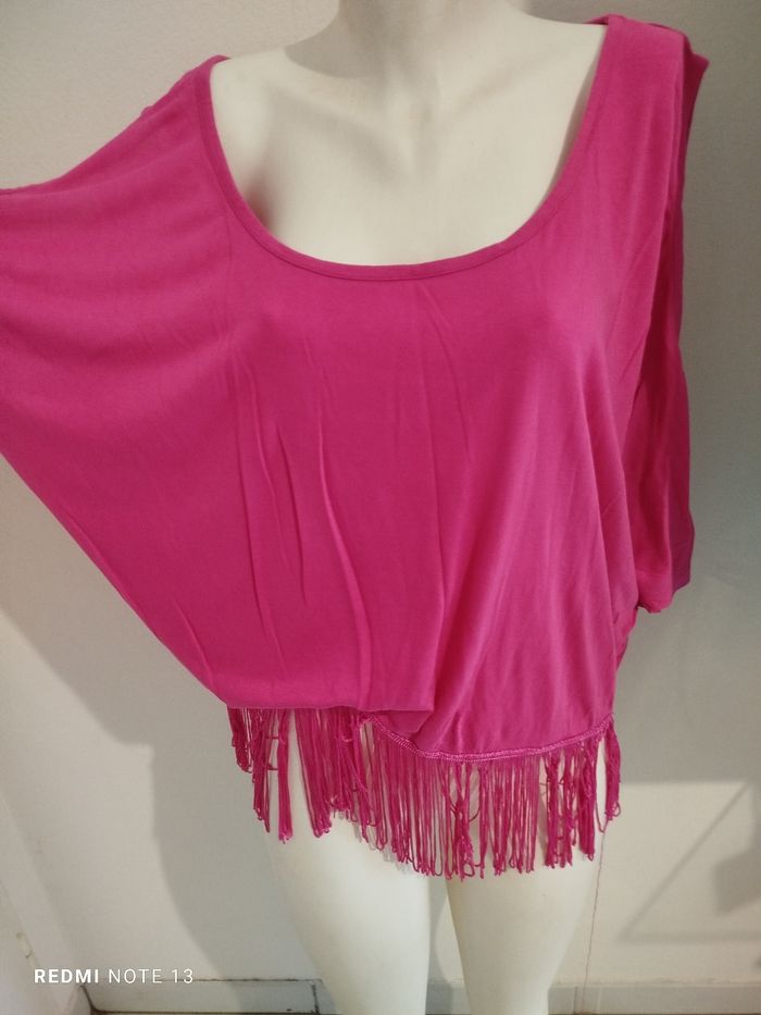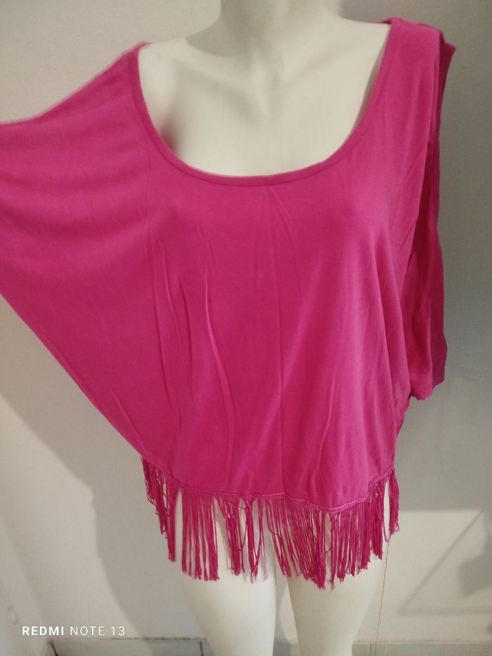 #kytieXXLfemme. Top frange épaules dénudées taille XXL de marque K woman rose fushia col rond 100 % viscose mesure des épaules 48 cm des aisselles 70 centimètres hauteur hors frange 60 cm avec les franges 75 cm tissu fluide léger épaule dénudée en état comme neuf vraiment superbe 😍👍🌸 ref 630