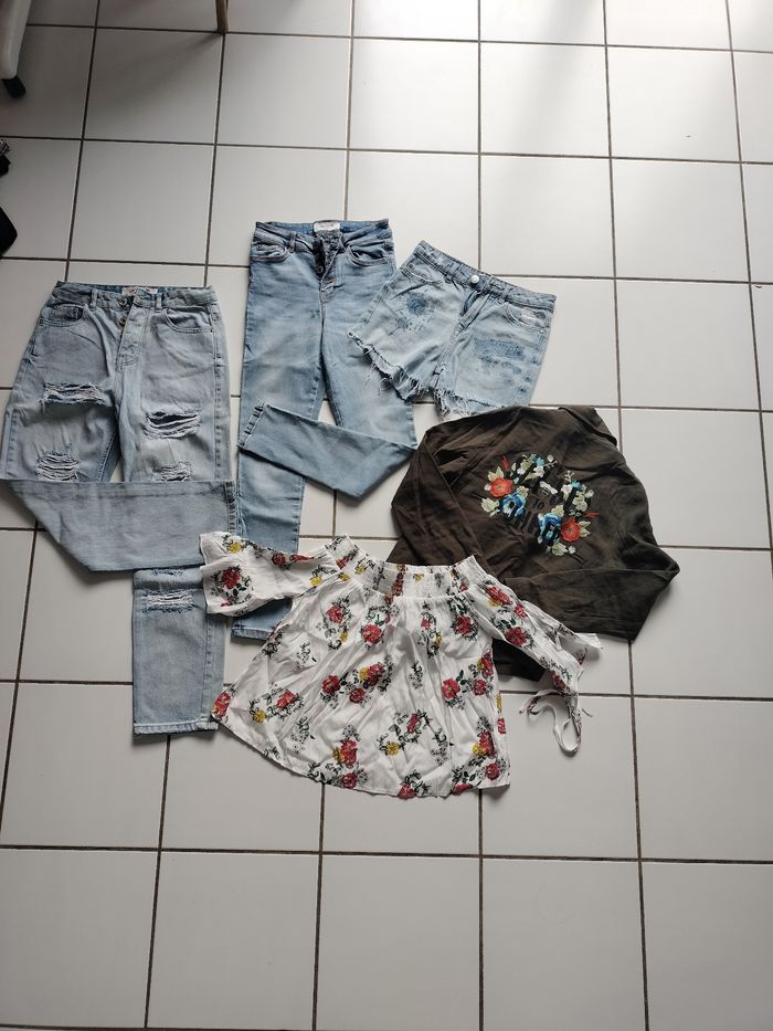 Vêtements XS avec 4 jean slim, 1 jupe en jean, 1 robe à pois Esprit, 1 haut manches courtes rouge, 1 haut manches courtes col cheminée, 1 veste ICode, 1 jean droit troué, 1 short en jean liberto, 1 haut léger manches 3/4. Principalement de marque Jennyfer