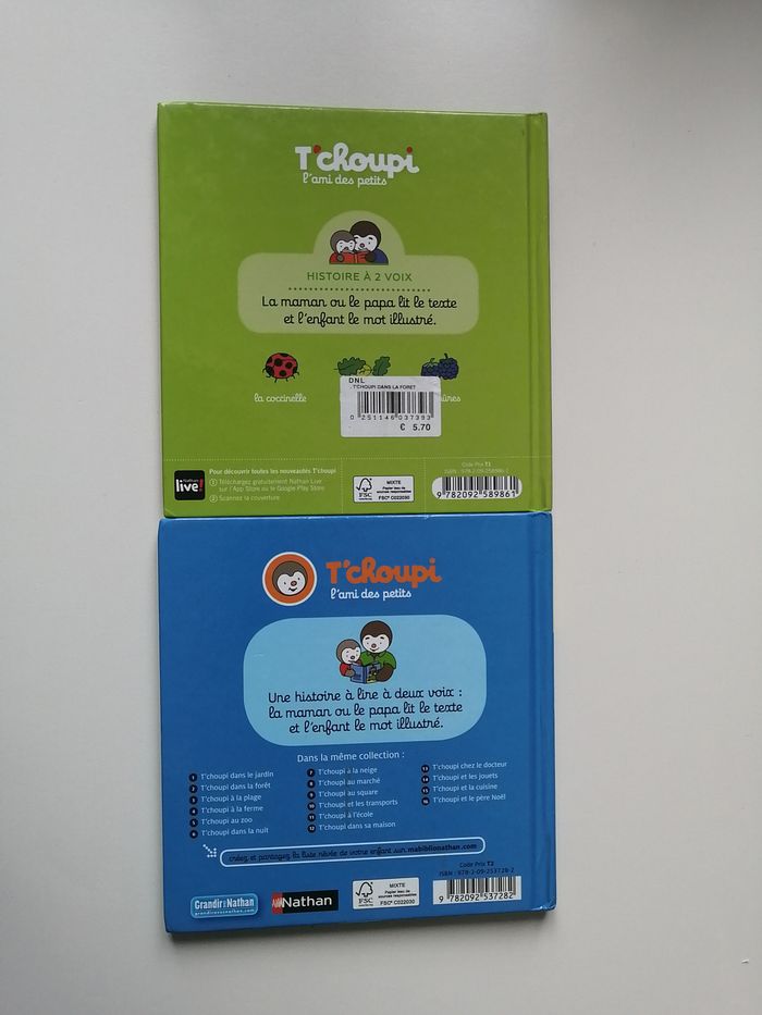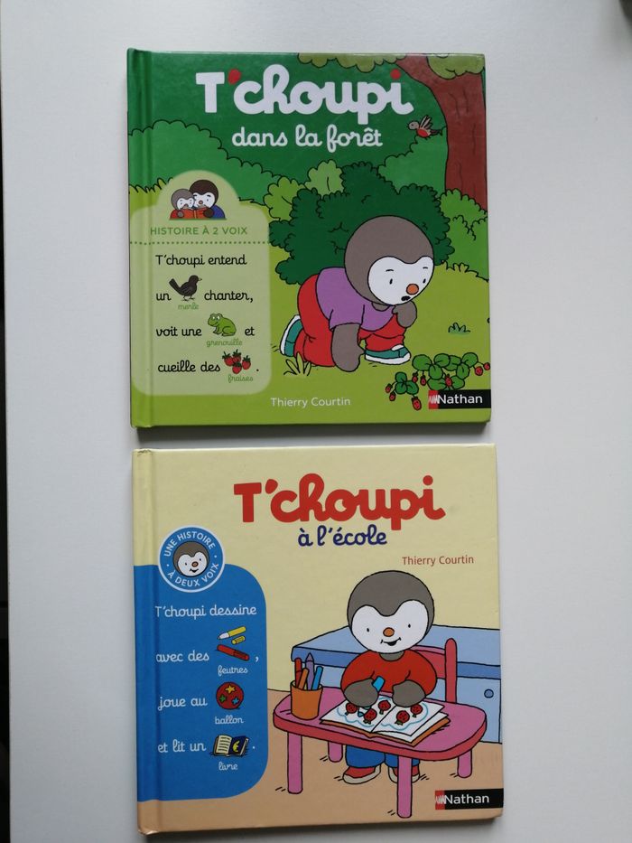 lot de 2 livres pages plastifiées histoire à 2 voix nathan t'choupi dans la forêt ISBN 9782092589861 t'choupi à l'école ISBN 9782092537282