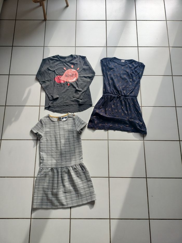 1 robe grise Okaïdi, 1 robe Tape à l'oeil, 2 débardeurs Tape à l'oeil, 1 jean mom, 1 legging sport, 1 jegging noir, 1 haut manches longues.