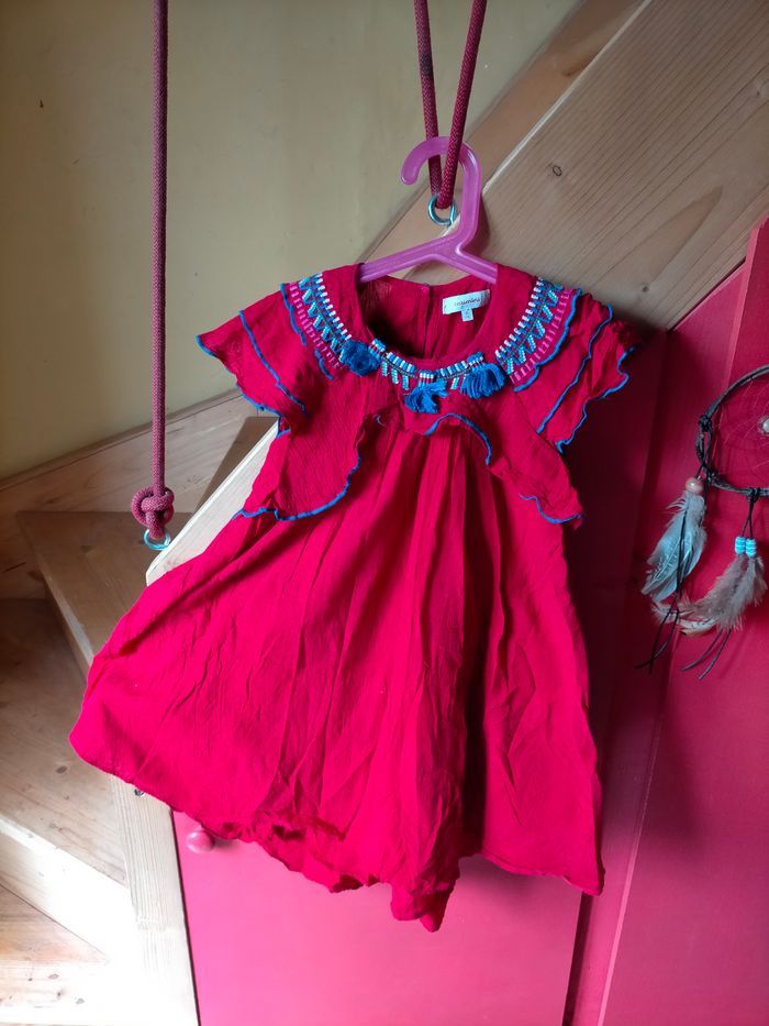 TBE Très jolie robe à manches volants en gaze de coton rouge. Broderies et pompons bleus sur le haut, boutons et étiquette catimini au dos
