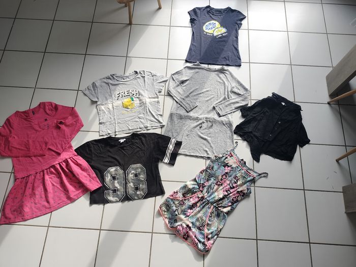 1 robe grise Mango, 1 combi short, 2 hauts manches courtes, 1 chemise fluide à nouer, 1 tee shirt IKks, 1 robe rose Sergent Major