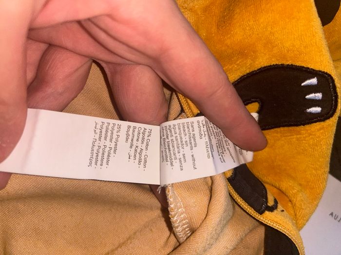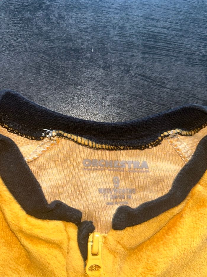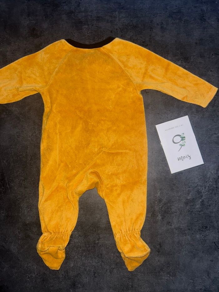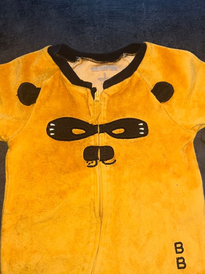 Pyjama bébé avec pieds Couleur orange Motif maque avec oreilles en reliefs et inscription « BB Bandit » Ouverture à l’avant par fermeture éclairé Taille : 9 mois / 71 cm