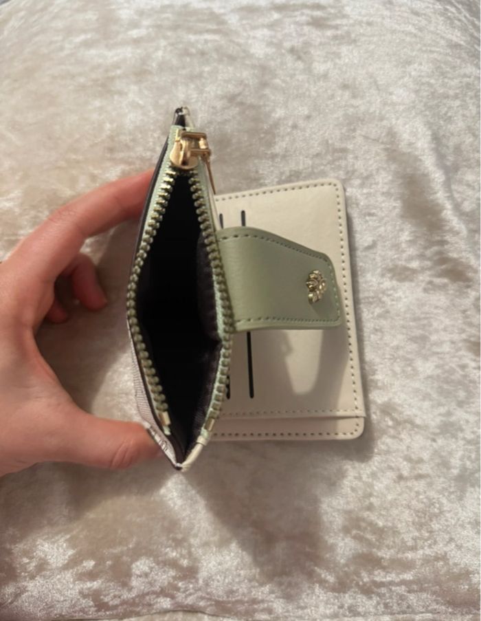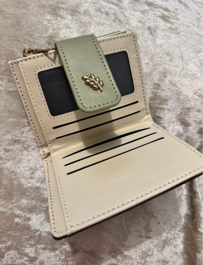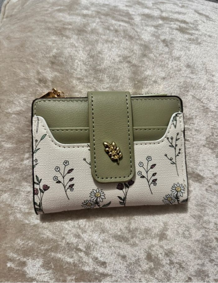 Ce portefeuille en similicuir allie délicatesse et fonctionnalité. Son motif floral discret s'harmonise parfaitement avec le vert pastel, pour un rendu à la fois doux et raffiné. Compact et bien organisé, il offre plusieurs compartiments pour cartes et monnaie. Le détail doré sur la patte de fermeture apporte