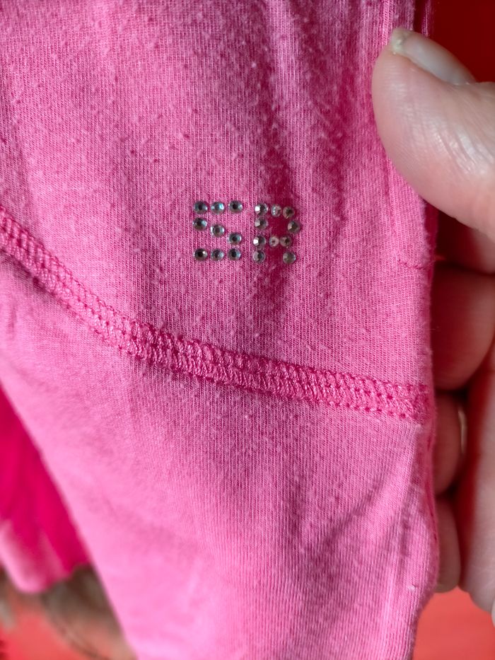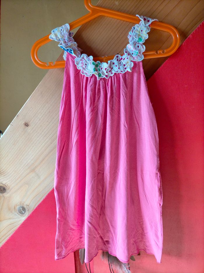 TBE même si présente de petites bouloches à peine visible. Très jolie robe en jersey rose. Col et bretelles en guirlande de fleurs blanches brodées multicolores. Deux poches latérales dont une avec initiales SR en strass