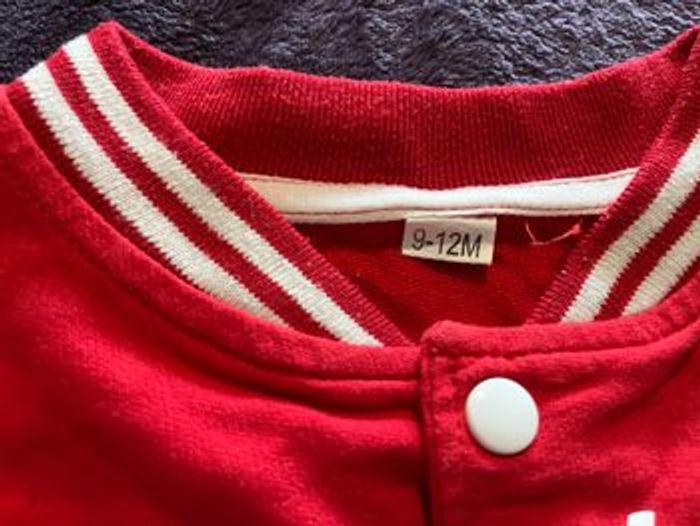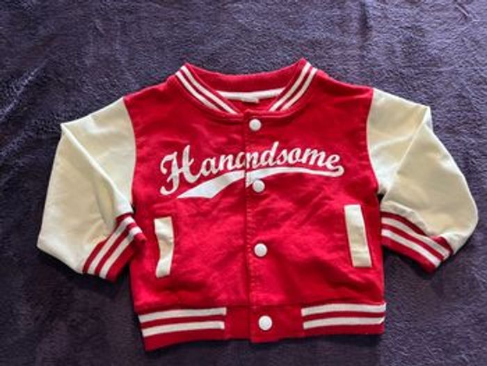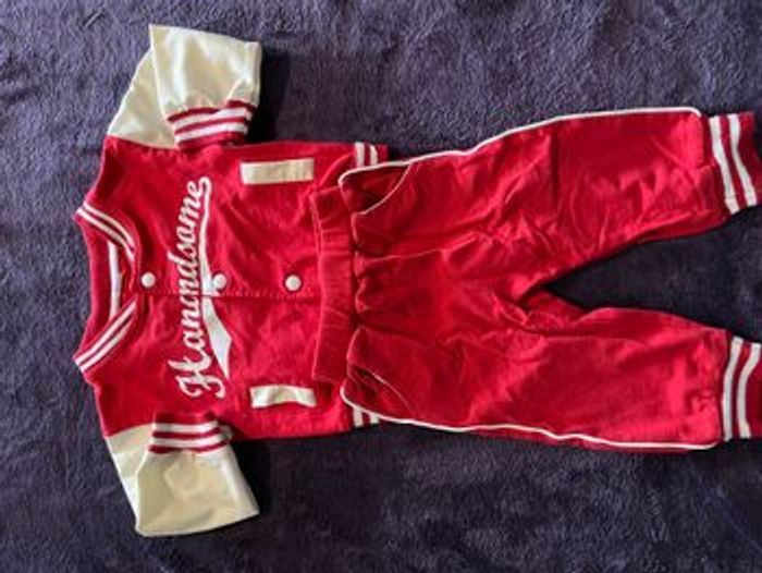 Adorable ensemble bébé garçon, taille 9-12 mois, composé d’une veste style teddy et d’un pantalon assorti. 🔴 Veste rouge à manches blanches, boutons pression, col et poignets rayés, imprimé "Handsome" en blanc. 🔴 Pantalon rouge avec bandes blanches sur les côtés et bas rayés assortis. 💯 Confortable et stylé. Idéal pour un look craquant au quotidien ou pour une occasion spéciale. Etat moyen. #ensemblejoggingbebegarcon912mois