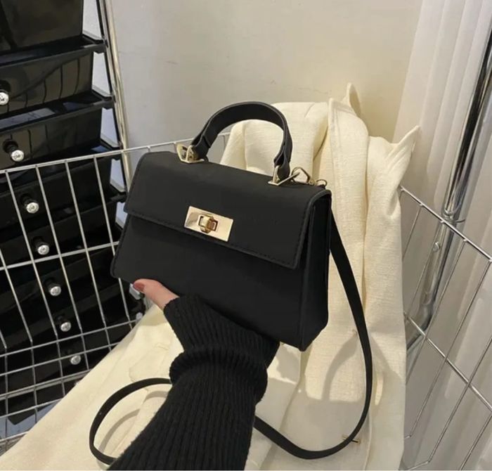 Élégant sac noir effet crocodile. Format rectangulaire structuré avec anse et bandoulière. Le fermoir twist doré et les pieds de protection dorés ajoutent une touche d'élégance. L'anse courte permet un portage main chic, tandis que la bandoulière amovible offre un portage croisé pratique