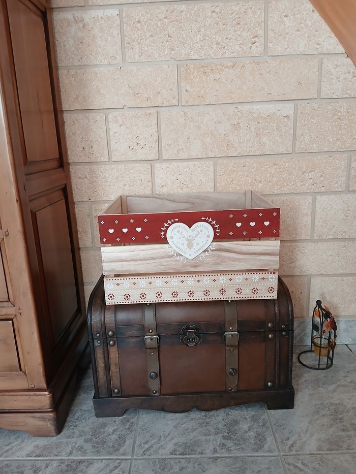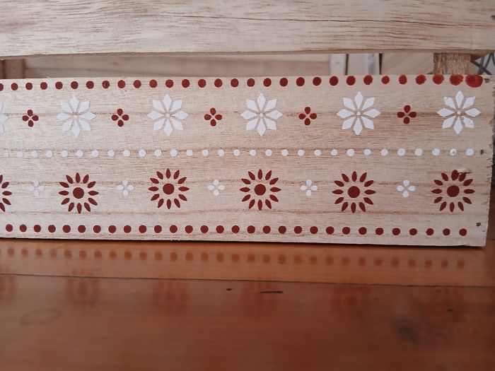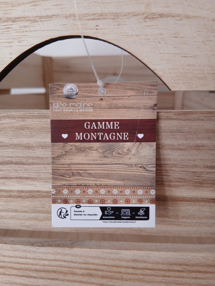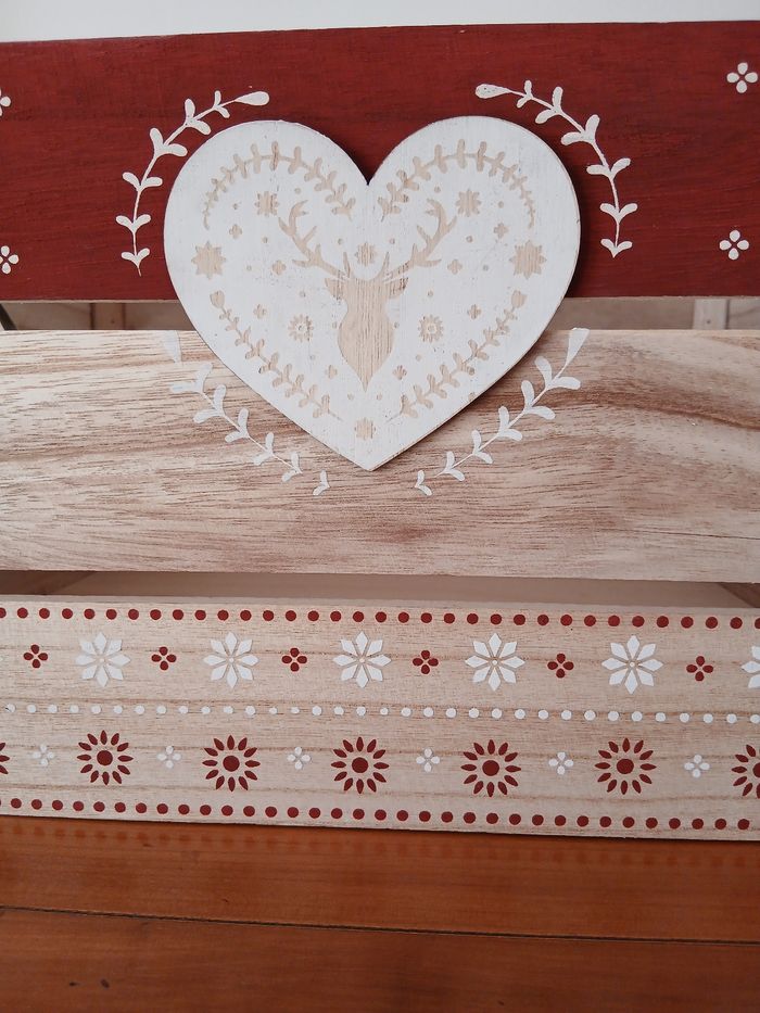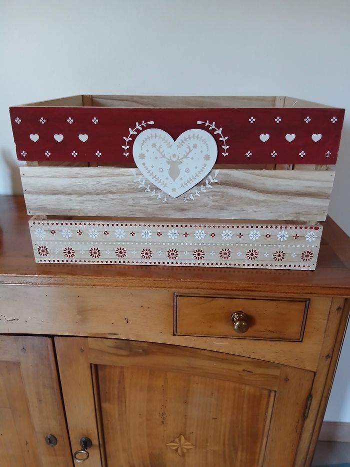 Article Neuf, encore étiqueté. Caisse/ Casier en bois [ contre-plaqué]; gamme montagne. Motifs peints devant; cœur en bois peint collé. Dimensions : 41 X 31 X 22 cm. Chaque panneau de bois a des stries, des marques et des teintes différentes inhérentes à la découpe // voir photos pour détails
