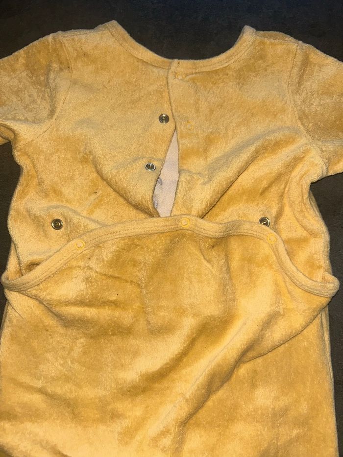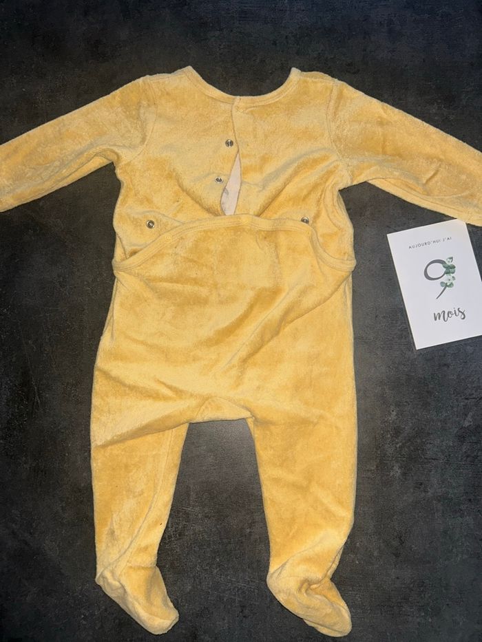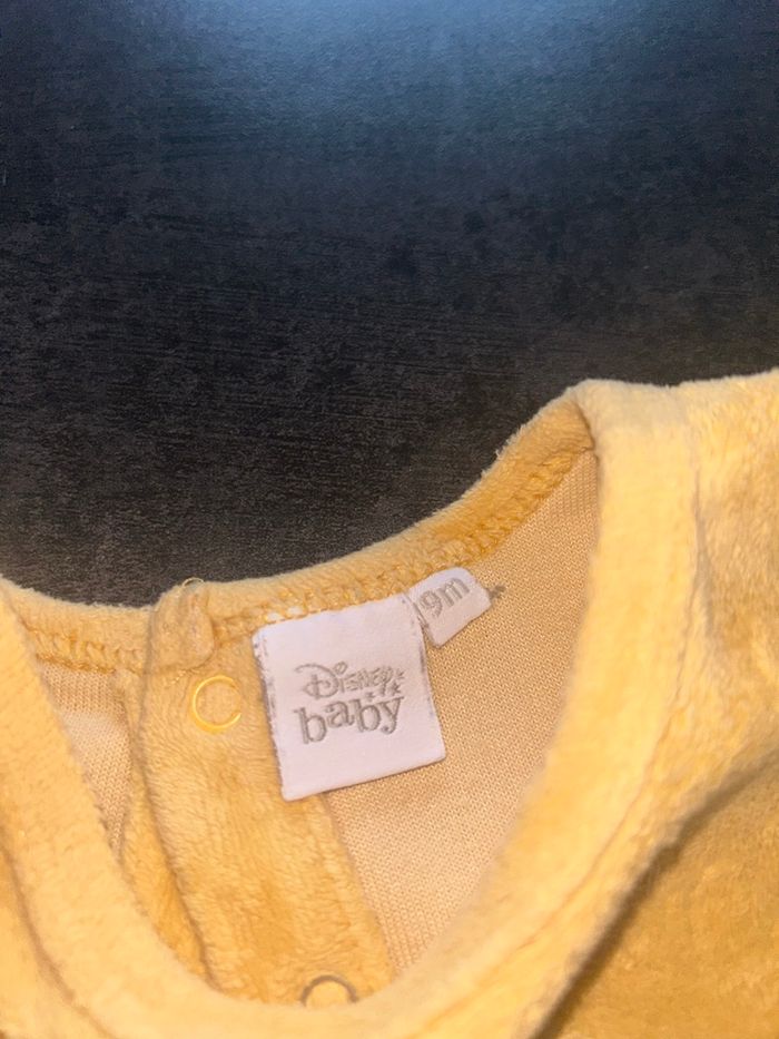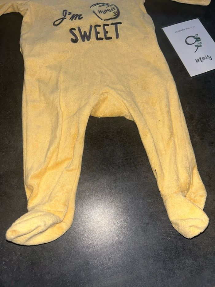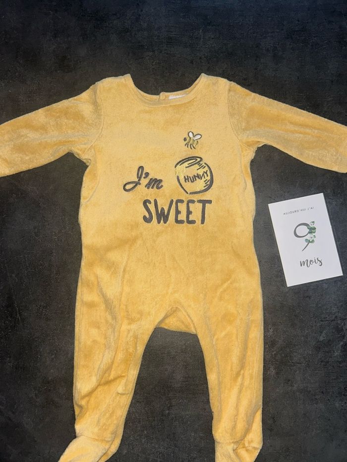 Pyjama bébé avec pieds Couleur : jaune Motif pot de miel avec inscription « hunny » et « I’m sweet » Ouverture à l’arrière par pressions Taille : 9 mois / 71 cm Mixte : peut convenir à une petite fille ou à un petit garçon