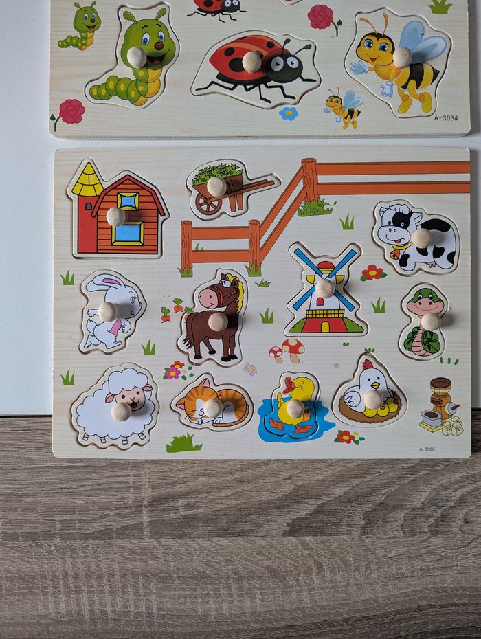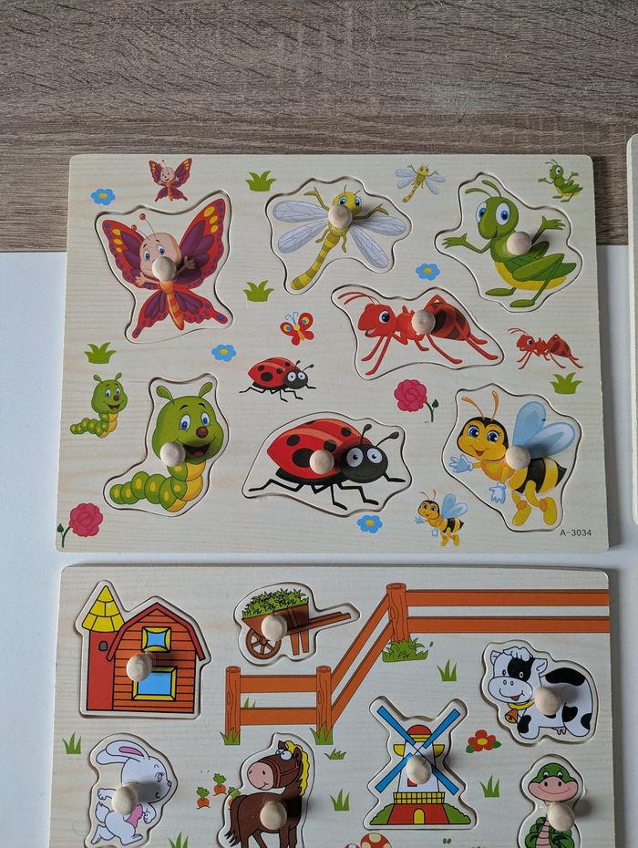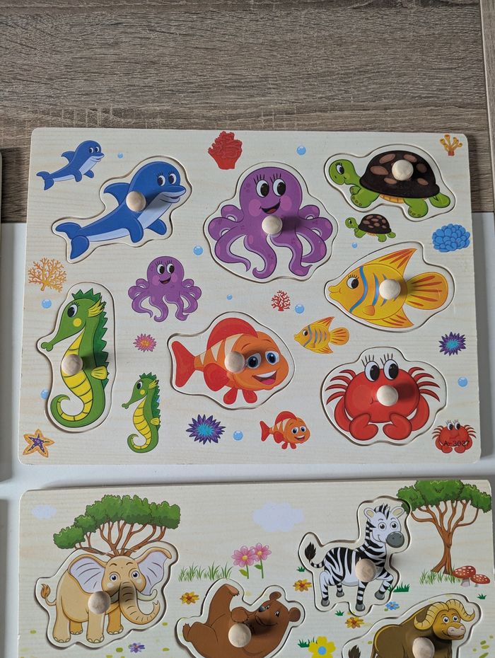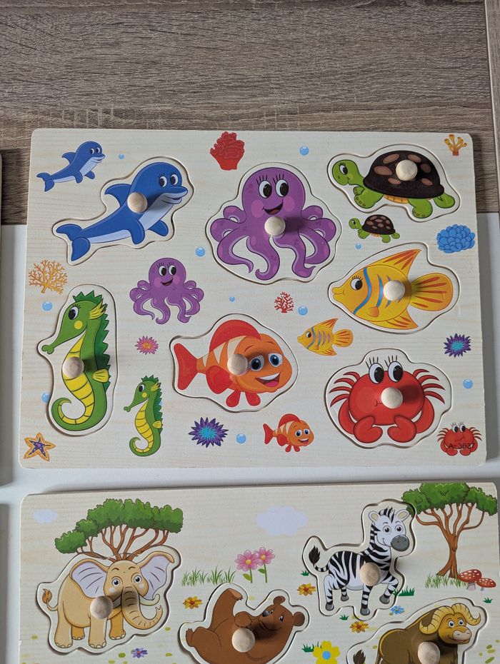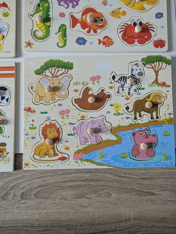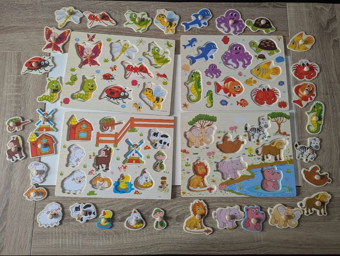 Lot 4 puzzles Bois Thème mer, ferme, savane, insectes Très bon état Envoi rapide et soigné