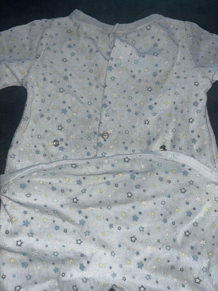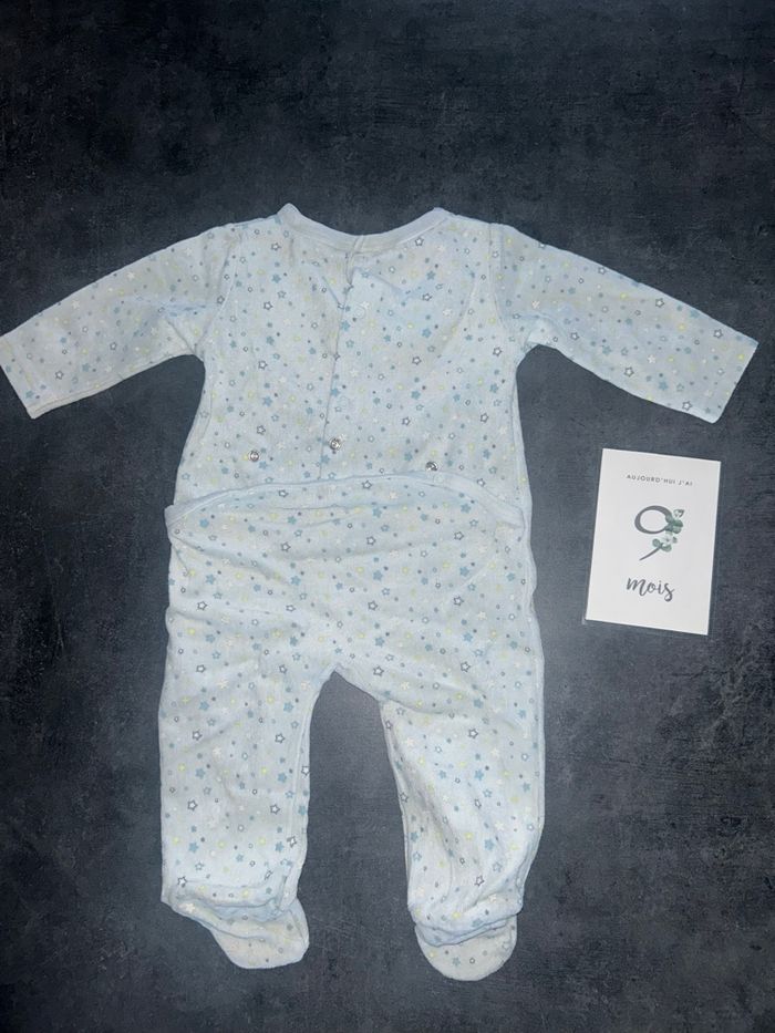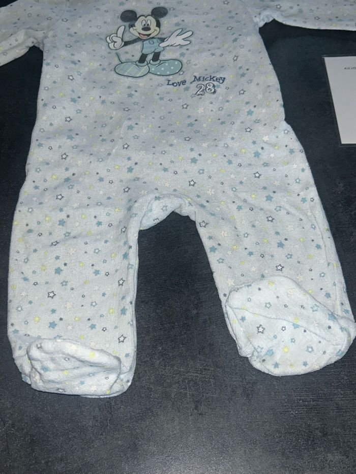 Pyjama bébé avec pieds Couleur : bleu Motif Mickey avec inscription « love Mickey 28 » et pleins de petites étoiles Ouverture à l’arrière par pressions Taille : 9 mois / 71 cm Mixte : peut convenir à une petite fille ou à un petit garçon