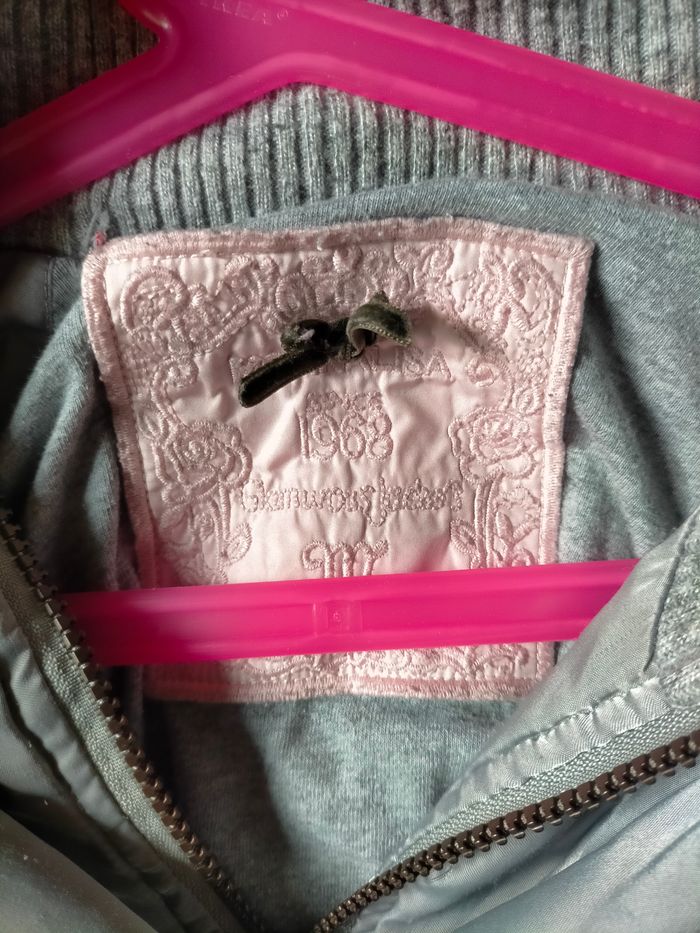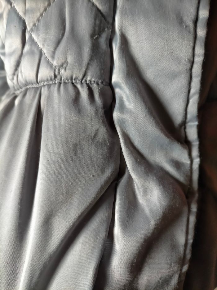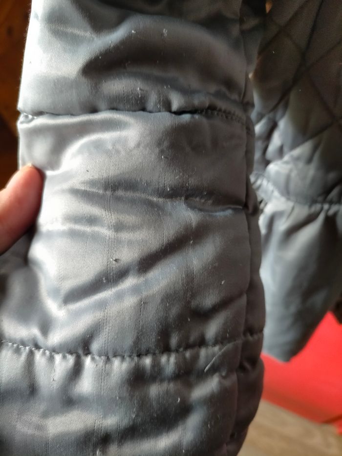 BE Traces d'usage voir photos mais ni trou, ni tâche toujours partante pour une seconde vie. Jolie parka avec capuche, bord fourrure amovible, façon satin cloisonné gris. Fermeture par zip et pressions. Tout petit prix car prix d'achat supérieur à 200 euro