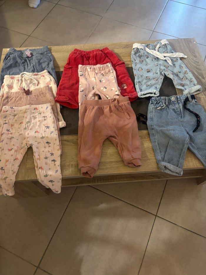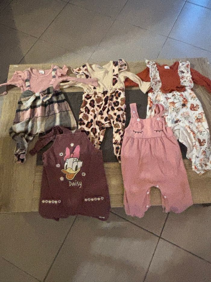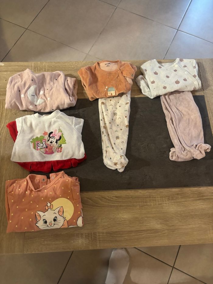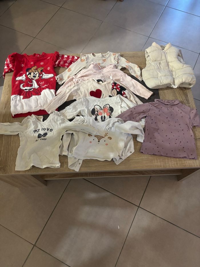 Lot de vêtement 1 robe pull 7 t-shirt manche longue 1 doudoune sans manche 4 combi 1salopette Disney 2 ensemble Disney dont celui de belle le pantalon est en 12 mois 1 ensemble pantalon body 1 ensemble body et combinaison en velours 3 body manche courte 8 body manche longue 6 pull 5 pyjama 8 pantalon
