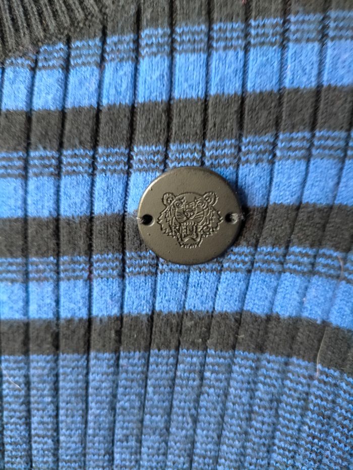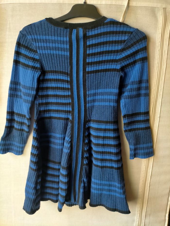 TBE Très jolie robe pull en maille douce et chaude bleu rayé noir. Médaille avec tête de tigre devant