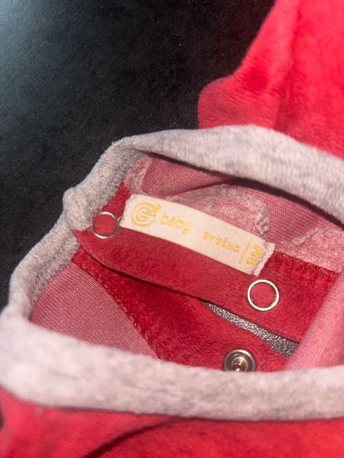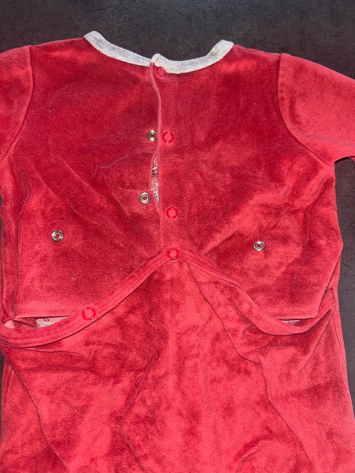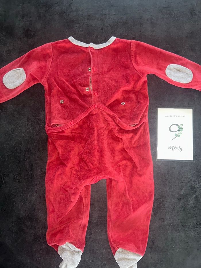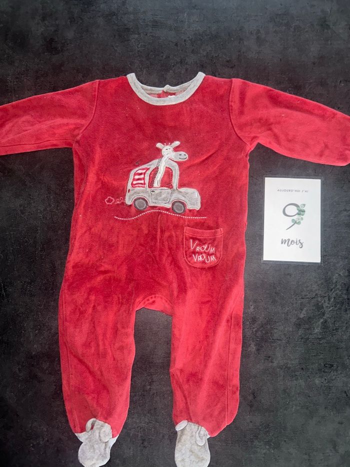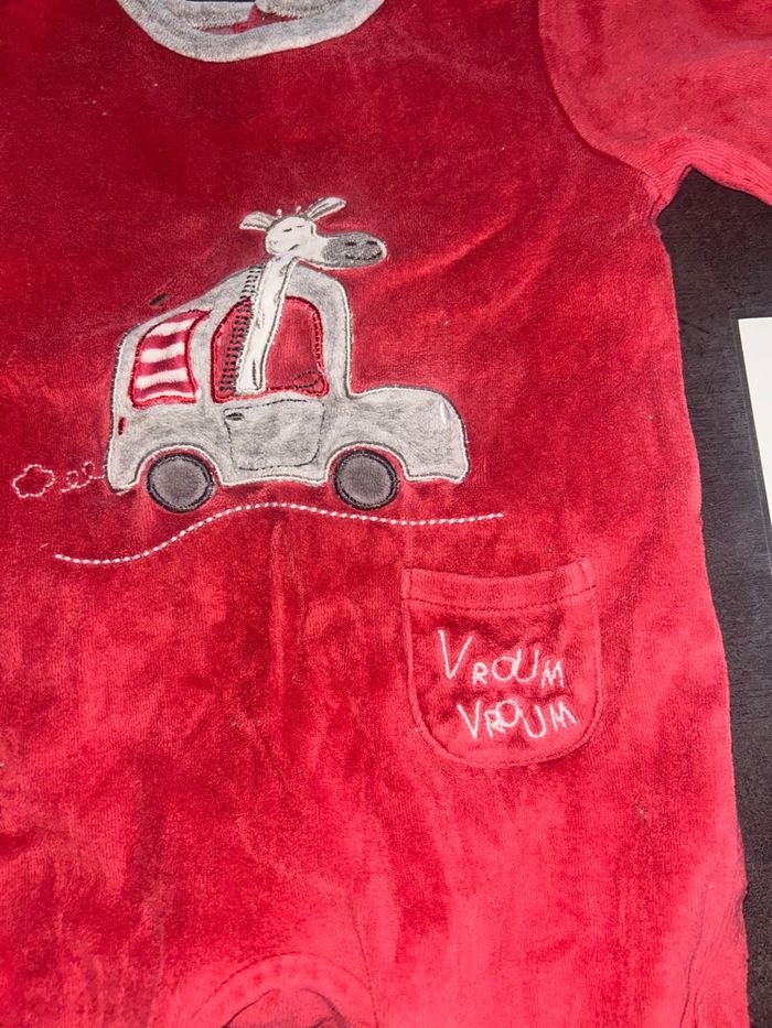 Pyjama bébé avec pieds Couleur : rouge Motif girafe dans une voiture inscription « vroum vroum » sur la poche Ouverture à l’arrière par pressions Taille : 9 mois / 71 cm