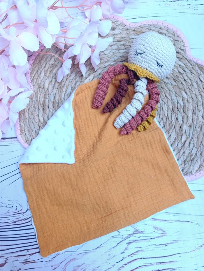 Doudou pieuvre au crochet Le bas est composé d'une face en coton, et l'autre face en minky Différents coloris possibles Dimensions du carré de tissu 25x25 cm Doudou 34.90€ Prénom flex thermocollant 2€ ou en broderie 4€ N'hésitez pas à me contacter pour plus de renseignements 💌