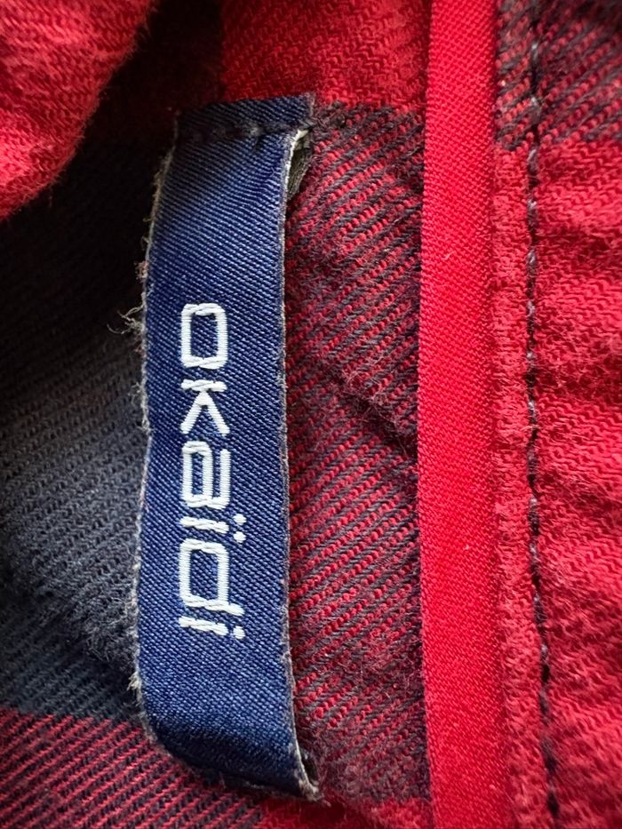 Chemise classique Okaïdi à carreaux à manches longues Très joli rendu, couleurs préservées Coupe droite. Base arrondie Col chemise avec boutons Ouverture boutonnée. Manche longues, poignets boutonnés. Possibilité de faire mi-manches avec attache bouton 100% coton ⚠️qqs traces du fait du repassage au niveau des manches versus fermeture , voir la dernière photo En très bon état