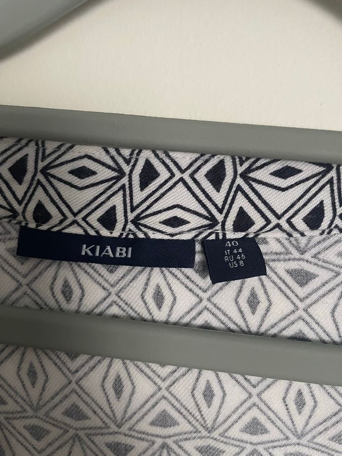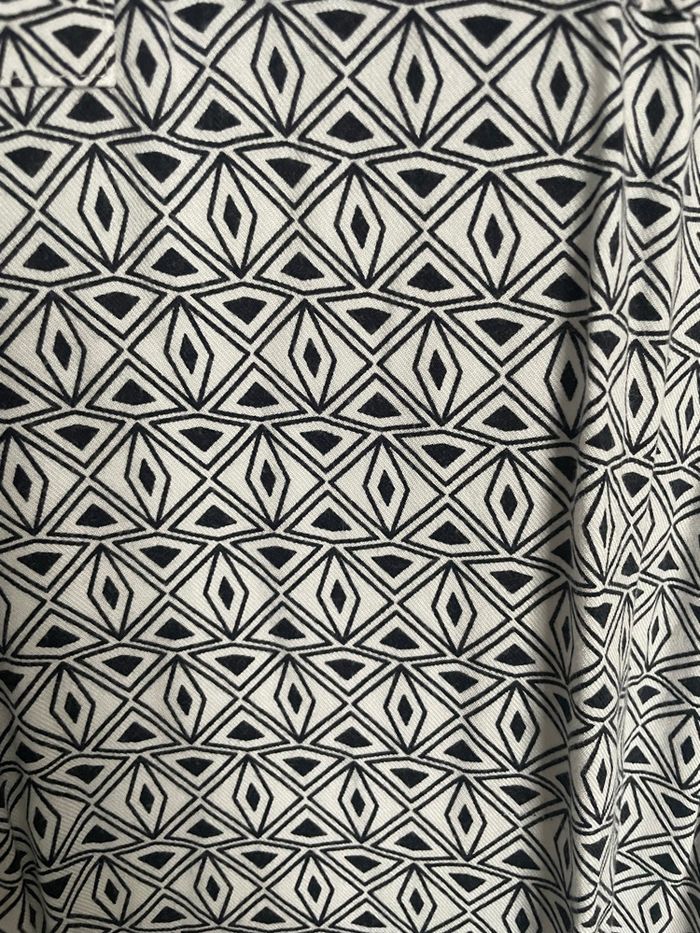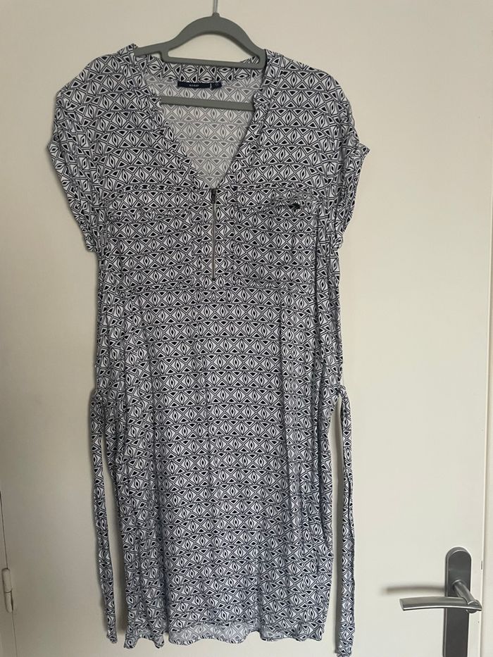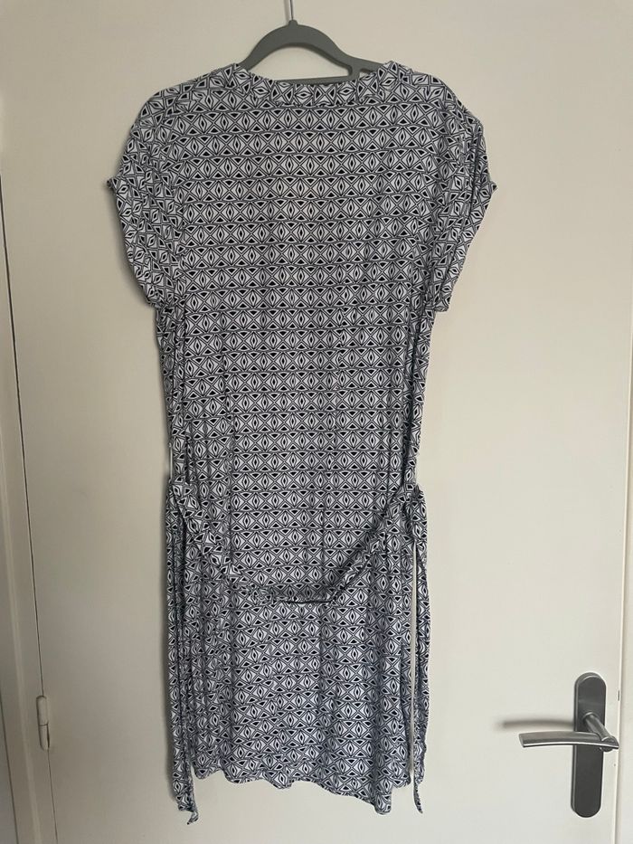 Robe courte blanc et noir, imprimé géométrique Manches courtes Col V Poches poitrine Décolleté fermé par une fermeture éclair Ceinture tissu à nouer Marque Kiabi taille 40