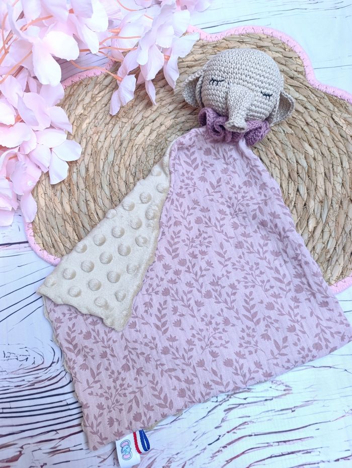 Doudou éléphant au crochet Le bas est composé d'une face en coton, et l'autre face en minky Différents coloris possibles Dimensions du carré de tissu 25x25 cm Doudou 34.90€ Prénom flex thermocollant 2€ ou en broderie 4€ N'hésitez pas à me contacter pour plus de renseignements 💌