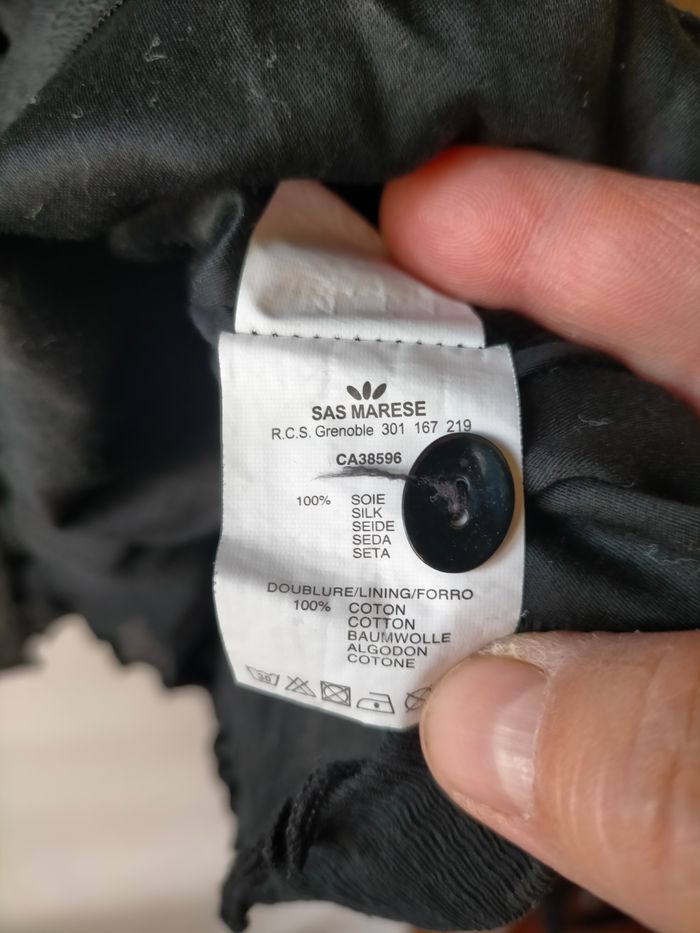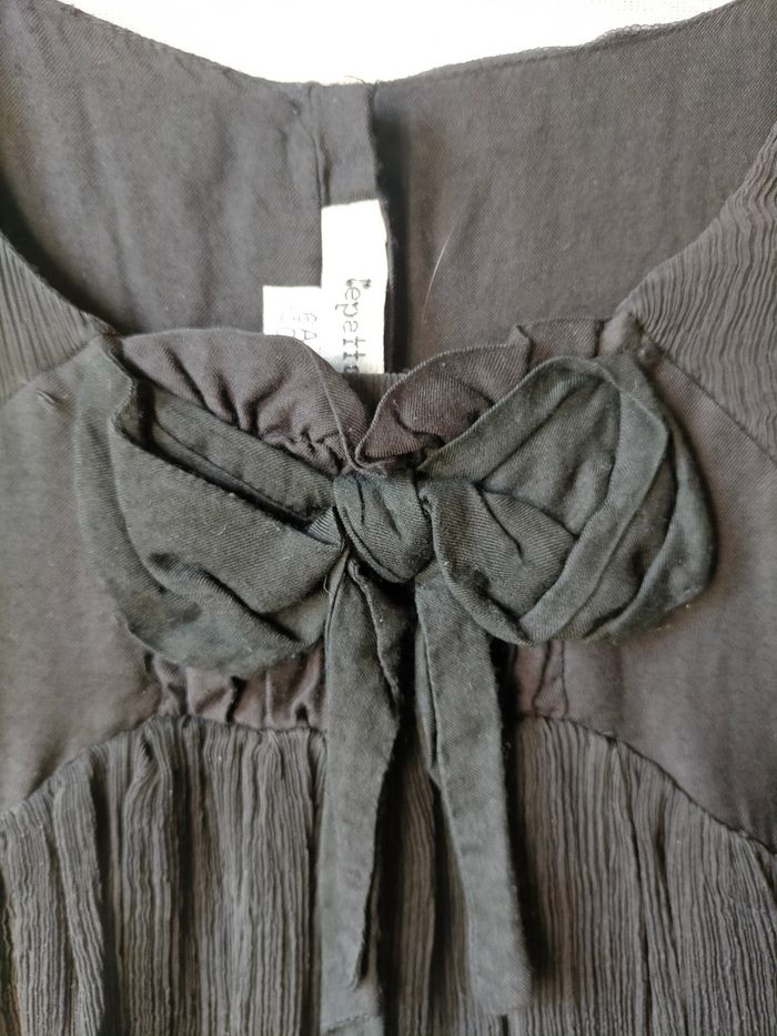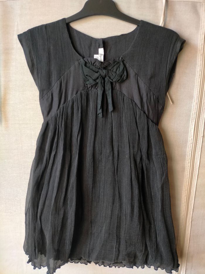 TBE Très jolie robe à petites manches en soie froissée noire. Nœud devant et boutons au dos, doublure coton. Très élégante