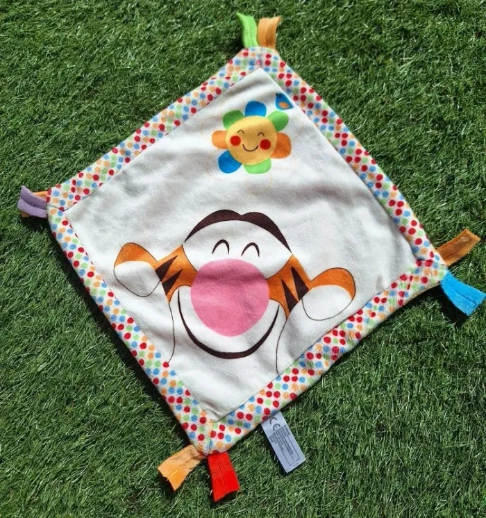 DOUDOU PLAT EN VELOURS BLANC ET CONTOUR A POIS DE COULEURS IMPRIME TIGROU SUR LE DOUDOU ET UN SOLEIL FLEUR AVEC UN PETIT OISEAU DES ETIQUETTES A CHAQUE COIN DU DOUDOU ETAT NEUF !