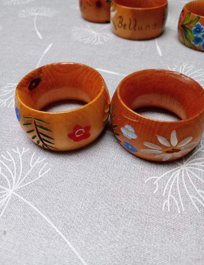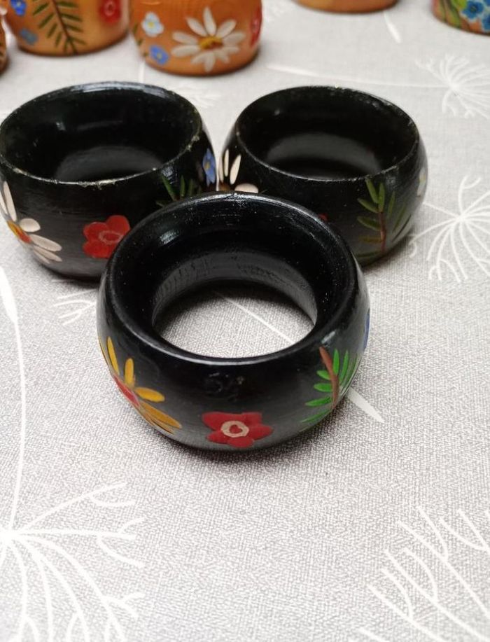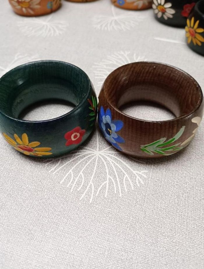 Lot de 12 ronds de serviette vintage, en bois, peints à la main. Ils sont tous en très bon état, sauf un noir qui est en bon état.