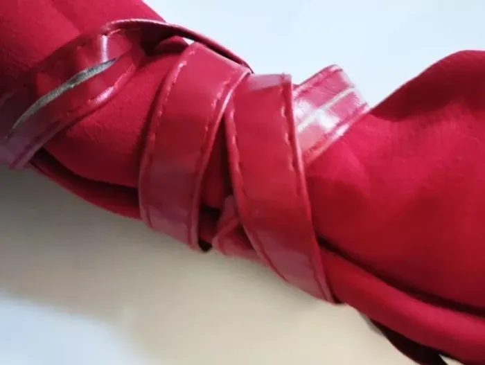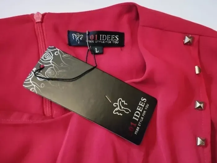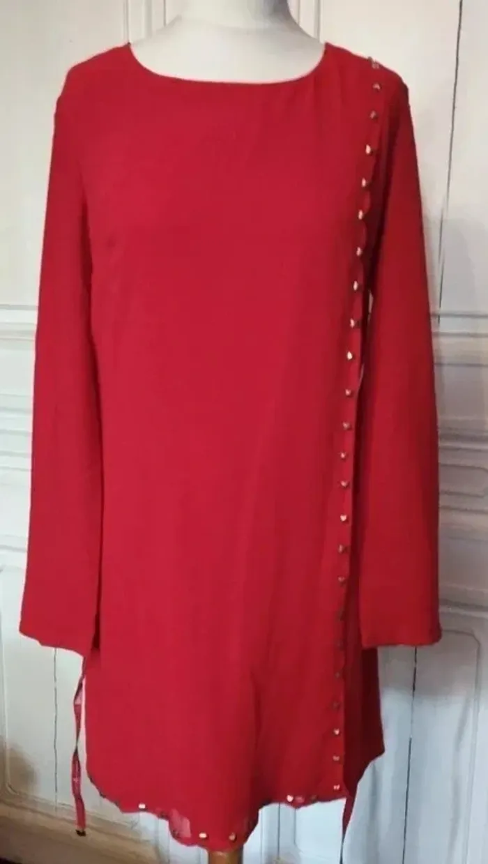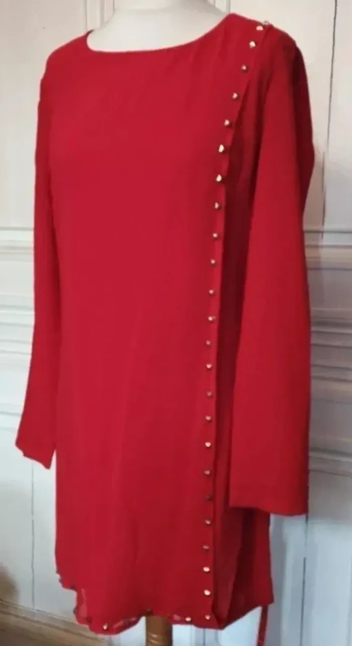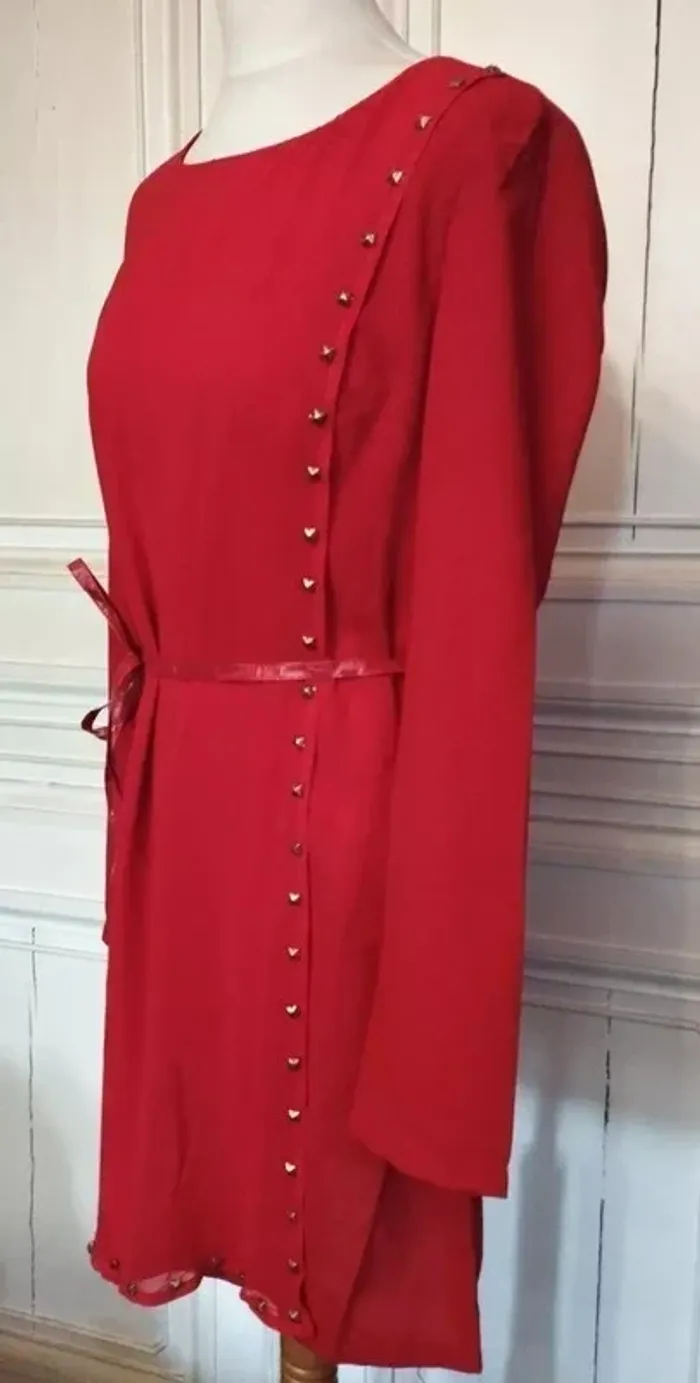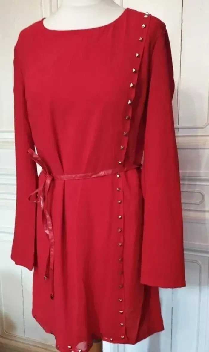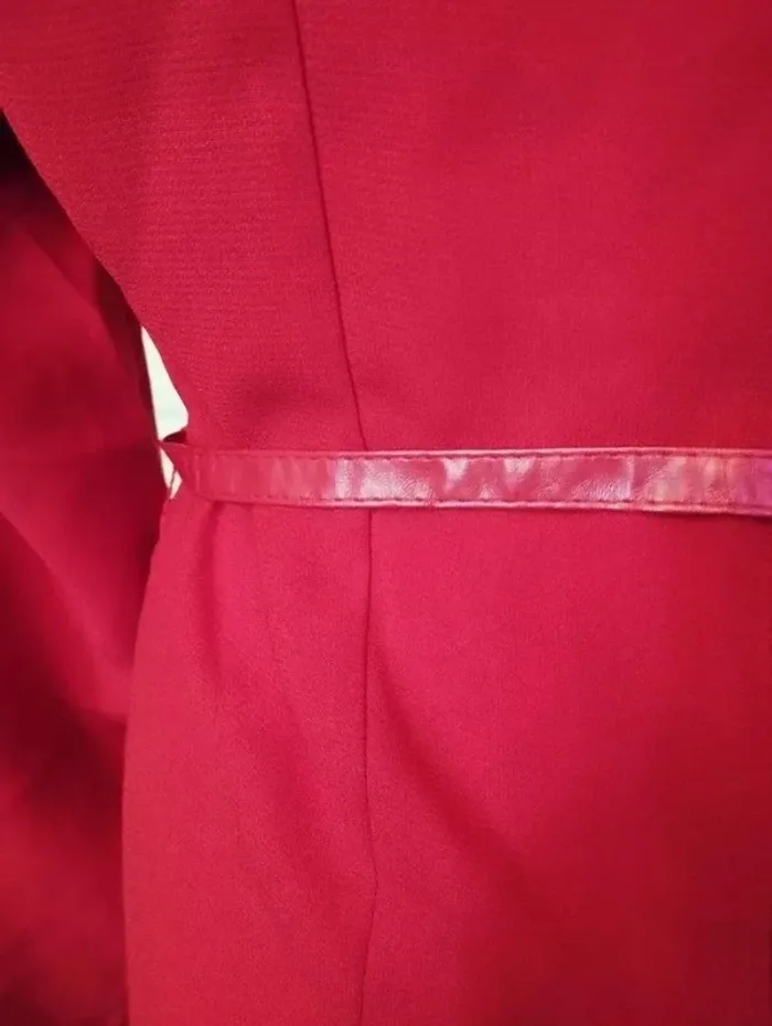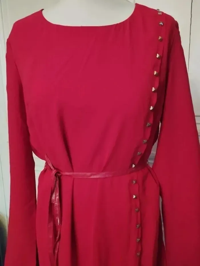 101 IDEES ROBE TM CORRESPOND A UN 36/40 VOIR MESURES AU BAS JOLI PIECE TRENDY FEMININE ALLURE RETRO FIFTIES VOILE OPAQUE PROCHE CREPE COLORIS ROUGE CERISE INTENSE COL OVALE OUVERTURE 21 CM PROFONDEUR 10 CM COUPE DROITE DEVANT GRAND PAN PARTANT DE L EPAULE GAUCHE JUSQUA U BAS DE LA ROBE TOUT LE LONG DU PAN SUR LE BORD DEVANT ET AU BAS DIZAINES DE POINçONS RELIEF PRISME METAL COLORIS OR MANCHES DROITES SUR LES COTéS DE LA TAILLE 2 PASSE CEINTURE CORDON LONGUE CEINTURE EFFET CUIR ROUGE CERISE 177 CM SUR 1 AVEC BOUTS MEDAILLONS METAL COLORIS OR POLI 2 PORTéS POSSIBLES CEINTURé OU DROITE EN JOUANT AVEC LES MOUVEMENTS DU PAN FERMETURE DOS ZIP CENTRAL INVISIBLE 44 CM AVEC ATTACHE GOUTTE D EAU ASSORTIE 97 % POLYESTER 3% ELASTHANE NON EXTENSIBLE EPAULES 39 CM POITRINE 45 CM TAILLE 41 CM HANCHES 45 CM BAS 55 CM MANCHES 61 CM LONGUEUR 85 CM