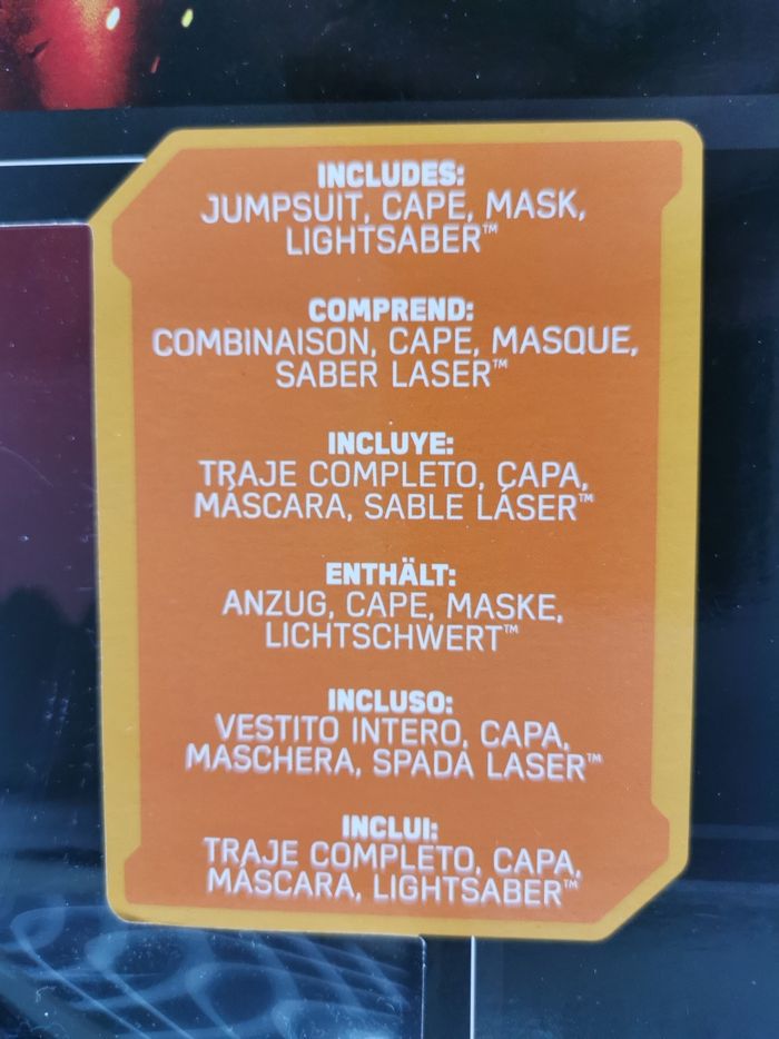 Combinaison avec torse imprimé, cape, masque pvc, ceinture et sabre laser. Jamais ouvert.