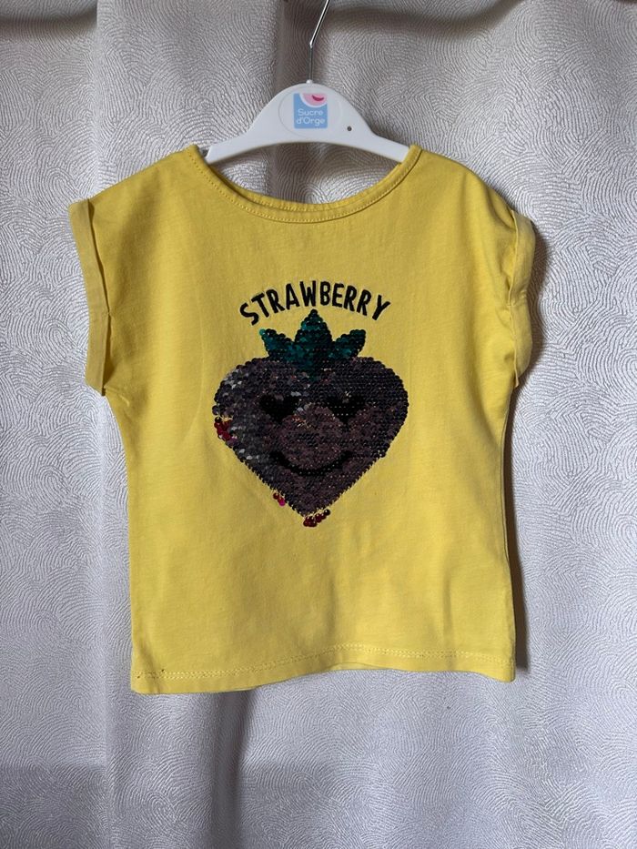 T-shirt jaune fraise rose sequins 4 ans Orchestra Bon état car un micro trou en bas sur la couture et aussi 2 micro tache sous la fraise, 2 points hyper discret