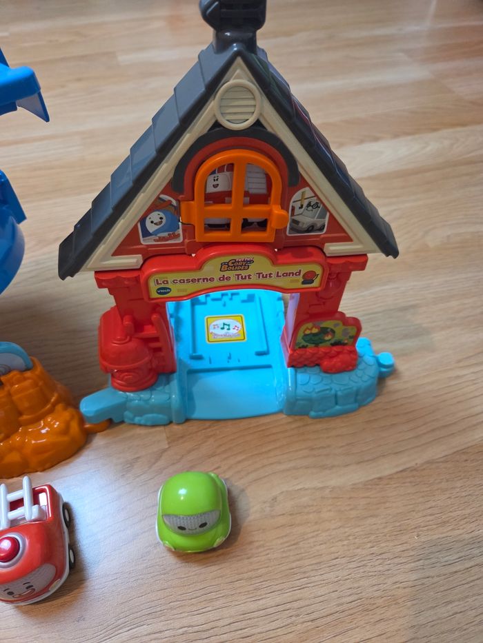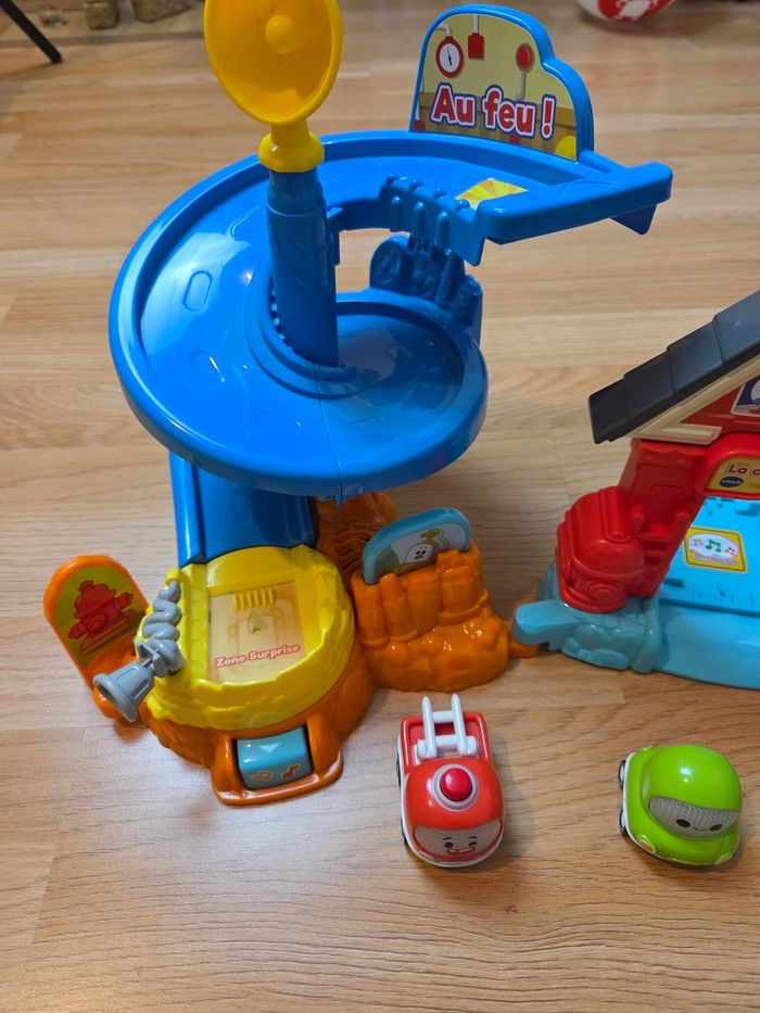 Caserne de pompiers VTech Tut Tut Bolides avec tour spirale « Au feu ! », rampe de descente et accessoires. Inclut 2 véhicules Tut Tut Bolides (camion de pompier et véhicule vert). Fonctionne parfaitement, sons et interactions OK. Bon état général, quelques traces normales d’utilisation. Idéal pour compléter un univers Tut Tut Bolides. #vtech #tuttutbolides #jouetenfant