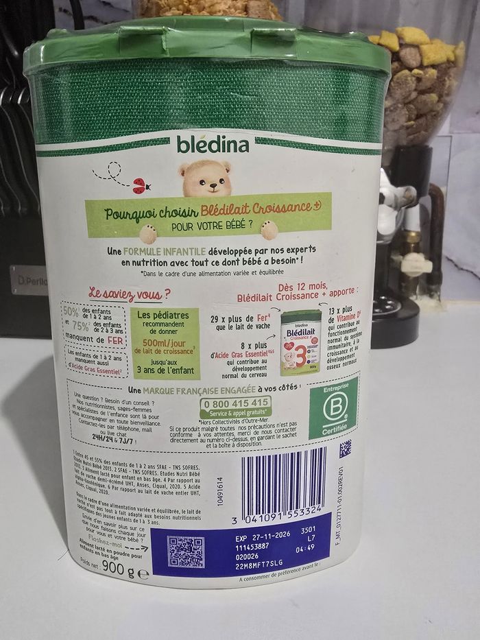 2 boites de Lait bledilait croissance plus, 3eme âge. Vous avez les 2 dates sur les boîtes. L'une le 27 novembre 2026 et l'autre le 21 octobre 2026. Jamais ouvert