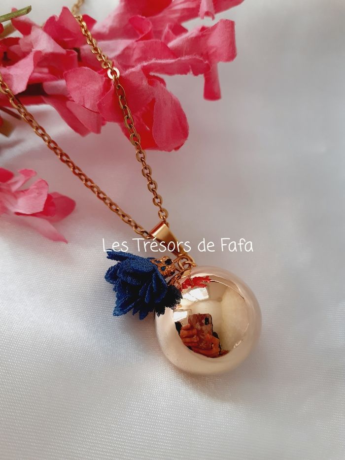 🤰 Bola de grossesse composé : - d'une chaîne en acier inoxydable doré d'une longueur d'environ 105 cm. - d'une boule sonore dorée en métal de diamètre 20 mm. - d'un pendentif fleur bleu nuit. 🌸 éviter de mettre la boule au contact de l'eau, parfum et humidité