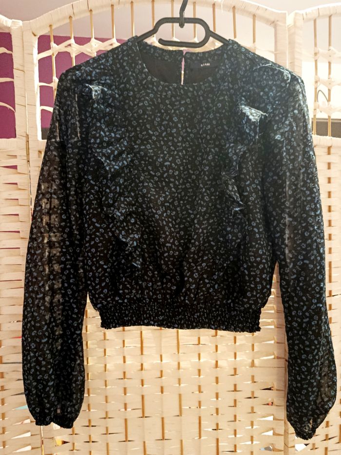 Bonjour, Je vend cette magnifique blouse noir à motif fleur bleu foncé. Il y a de jolies froufrous sur le devant. Manche légèrement transparente. Petit bouton à la nuque. Blouse qui n'a jamais été portée. Aucun défaut. Acheter chez Kiabi. #blousemancheslongues #motiffloral #noiretbleu #blousefemme