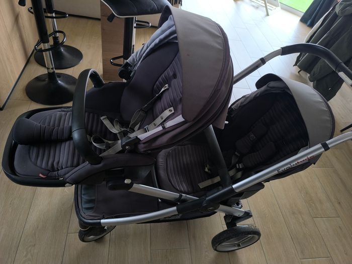 Poussette double en bon état, manque deux petits tissus pour les bretelles mais n'empêche absolument pas l'utilisation. Vendue avec habillage pluie pour les deux fauteuils. À venir chercher sur place