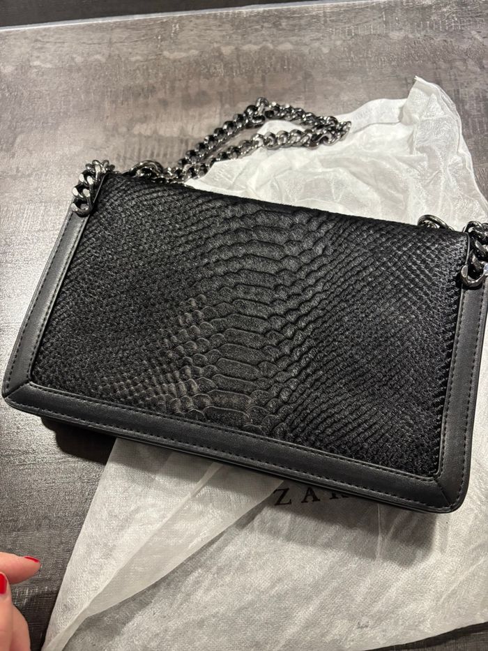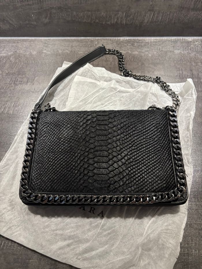 Superbe sac à main Zara en cuir de vachette, imprimé serpent. Porté épaule avec chaîne (non bandoulière). ✨ Très bon état général Petites usures uniquement à l’intérieur (voir photos). Chic et tendance, parfait pour accessoiriser vos tenues. Envoi rapide et soigné 📦