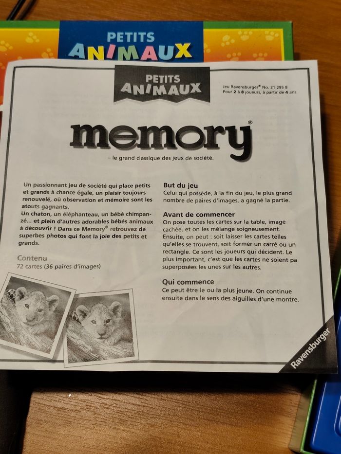 Memory "Petits animaux" Jeu complet (72 cartes et notice de jeu) Ravensburger
