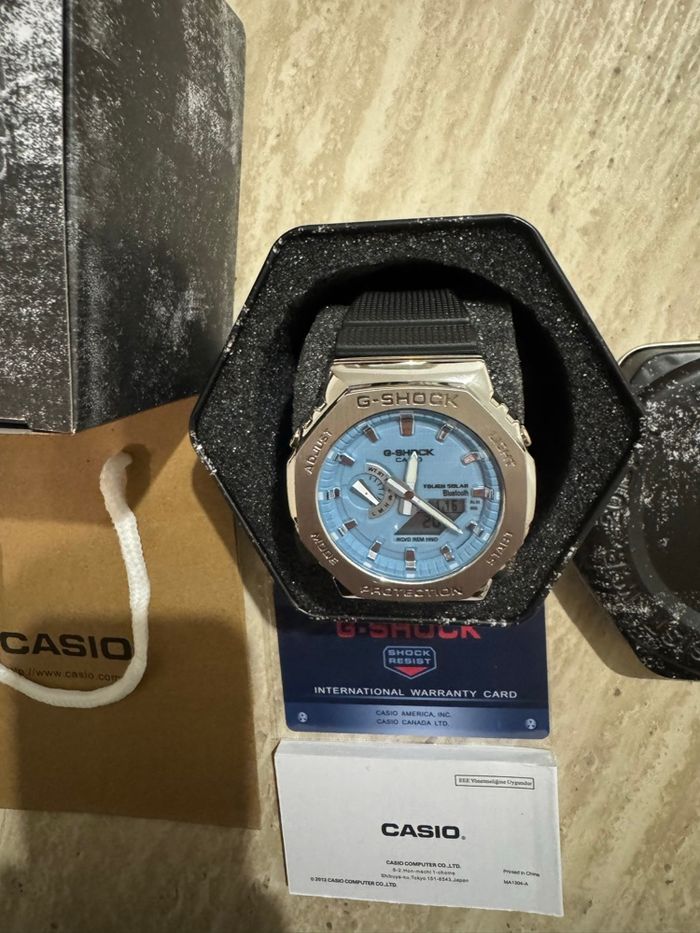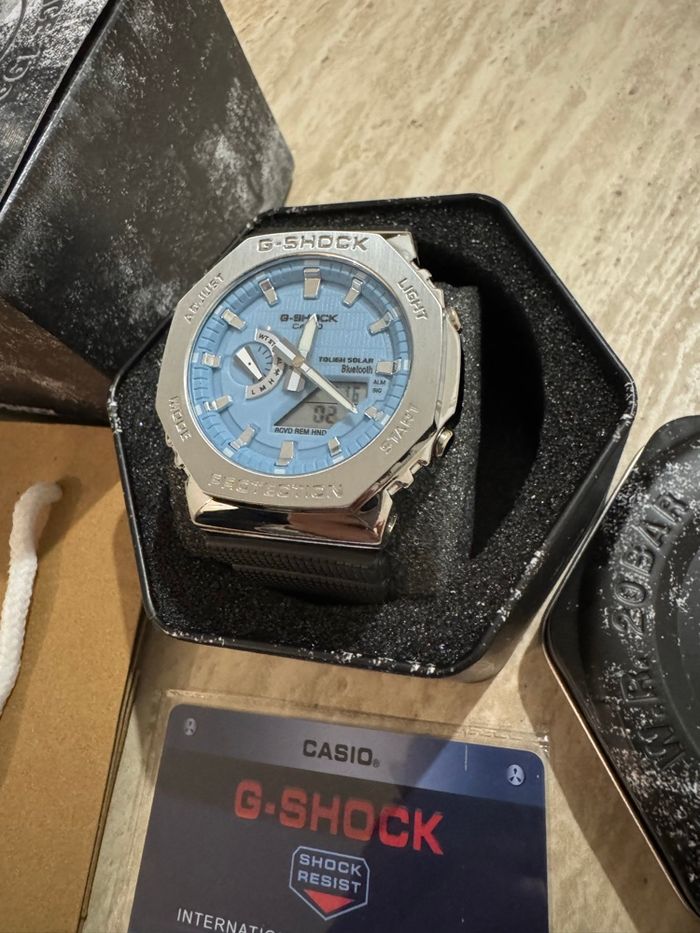 G-Shock GM-2100 avec boîtier métal et bracelet en silicone , cadran Bleu ciel et finitions premium. Modèle robuste, élégant et très recherché. Montre Neuve, jamais portée Boîte G-Shock Surboîte Carte G-Shock Notices Sac Casio Résistante aux chocs Étanchéité 200 m Affichage analogique + digital Verre minéral Envoi rapide et soigné