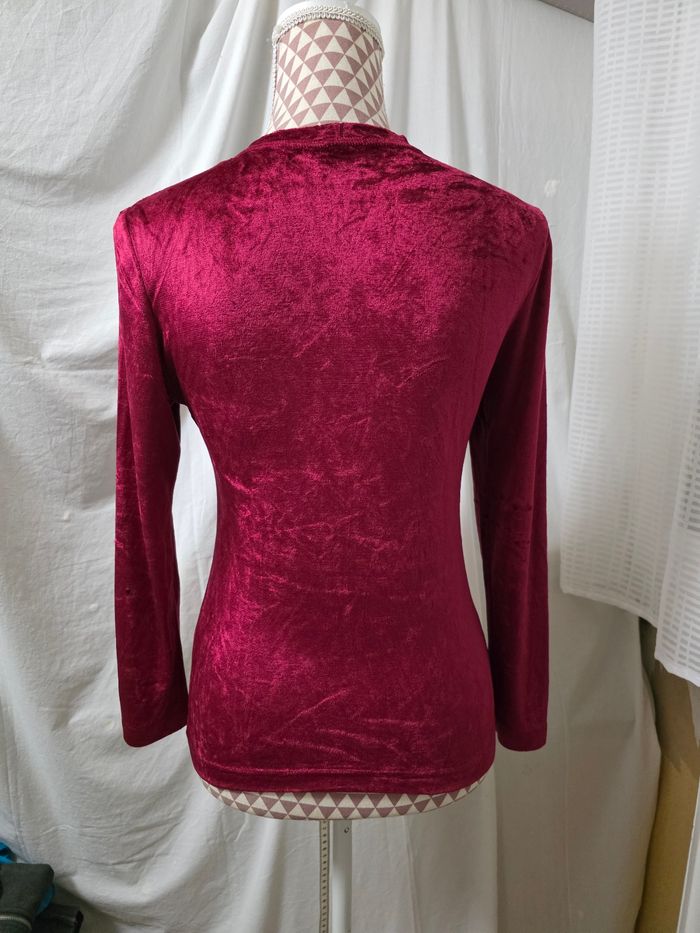 Tee-shirt,bordeaux,façon velours, ML,en très très bon état, en viscose&polyester, largeur d'épaule 35cm, largeur sous bras 43cm, longueur 55cm, marque Pablo Paris/ Made in France=7€ - photo numéro 3