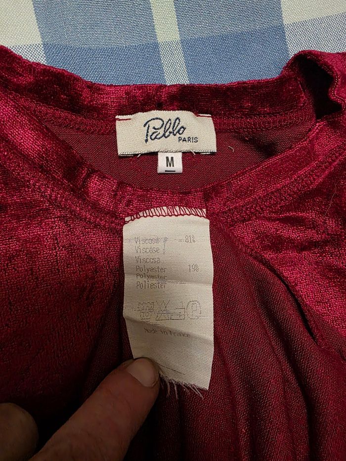 Tee-shirt,bordeaux,façon velours, ML,en très très bon état, en viscose&polyester, largeur d'épaule 35cm, largeur sous bras 43cm, longueur 55cm, marque Pablo Paris/ Made in France=7€ - photo numéro 4