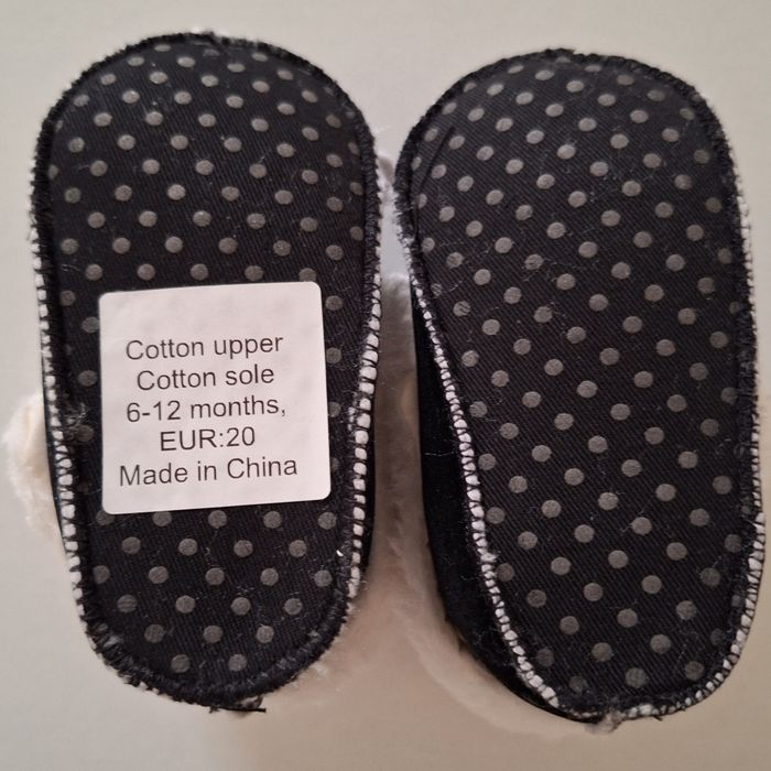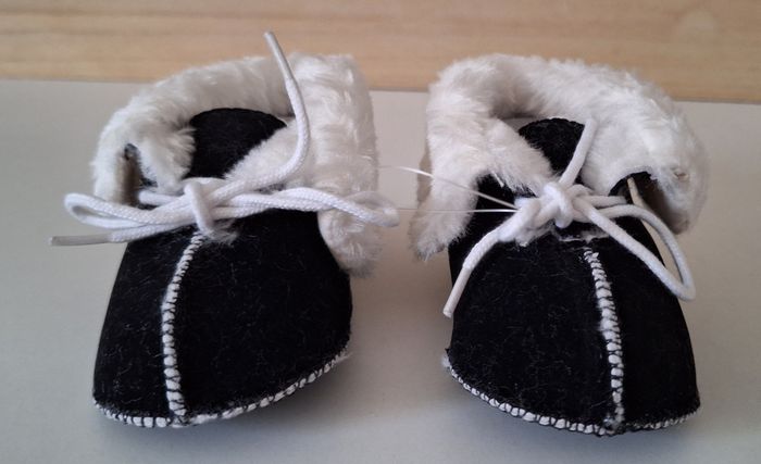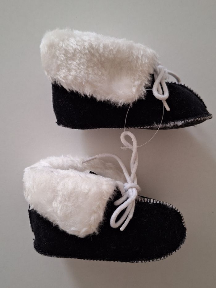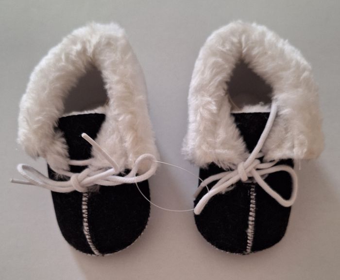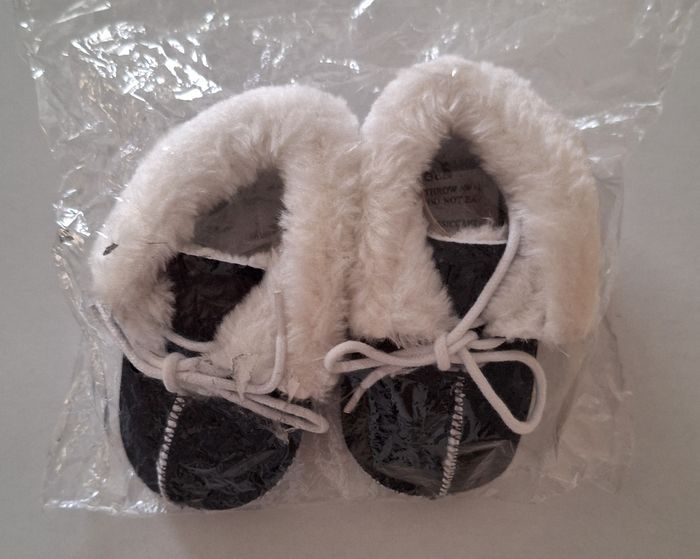 Neufs dans I'emballage. A lacets. Bien chauds car ils sont fourrés. Semelles antidérapantes. Tout doux au toucher velours. Dessus et semelles en coton. Pointure 6/12 mois. Peuvent être mixtes.