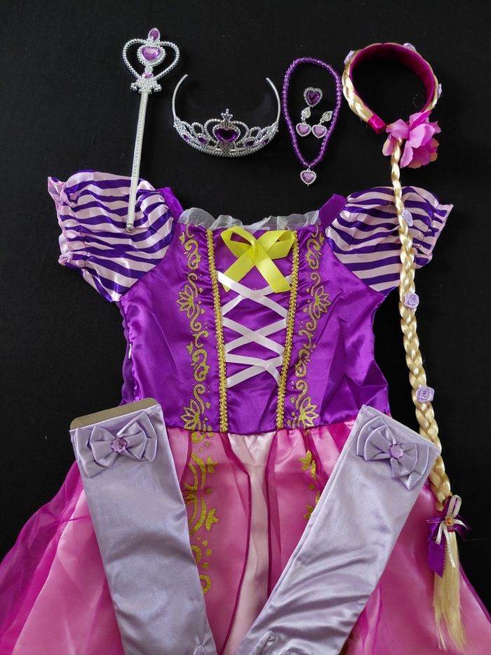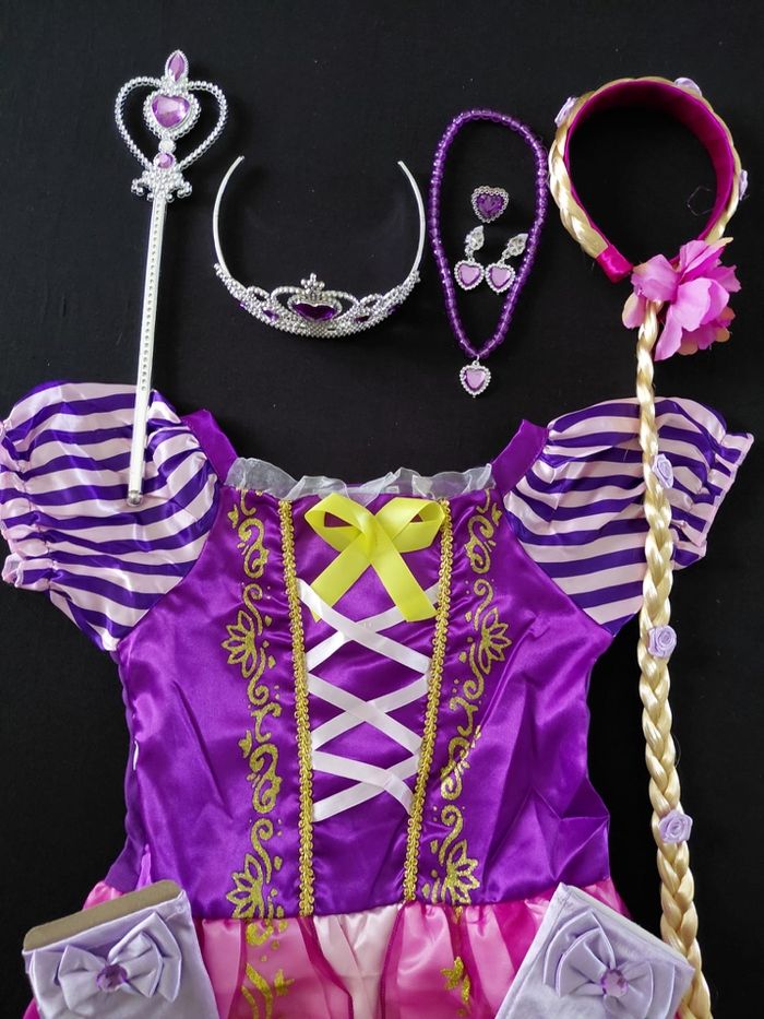 Déguisement robe princesse raiponce et ces accessoires (couronne, baguette, gants, bijoux, tresse). La robe mesure 80cm de longueur, la taille convient aux petites filles de 5-6ans. Totalement neuve, vendue dans son emballage d’origine. Expédition rapide après votre commande