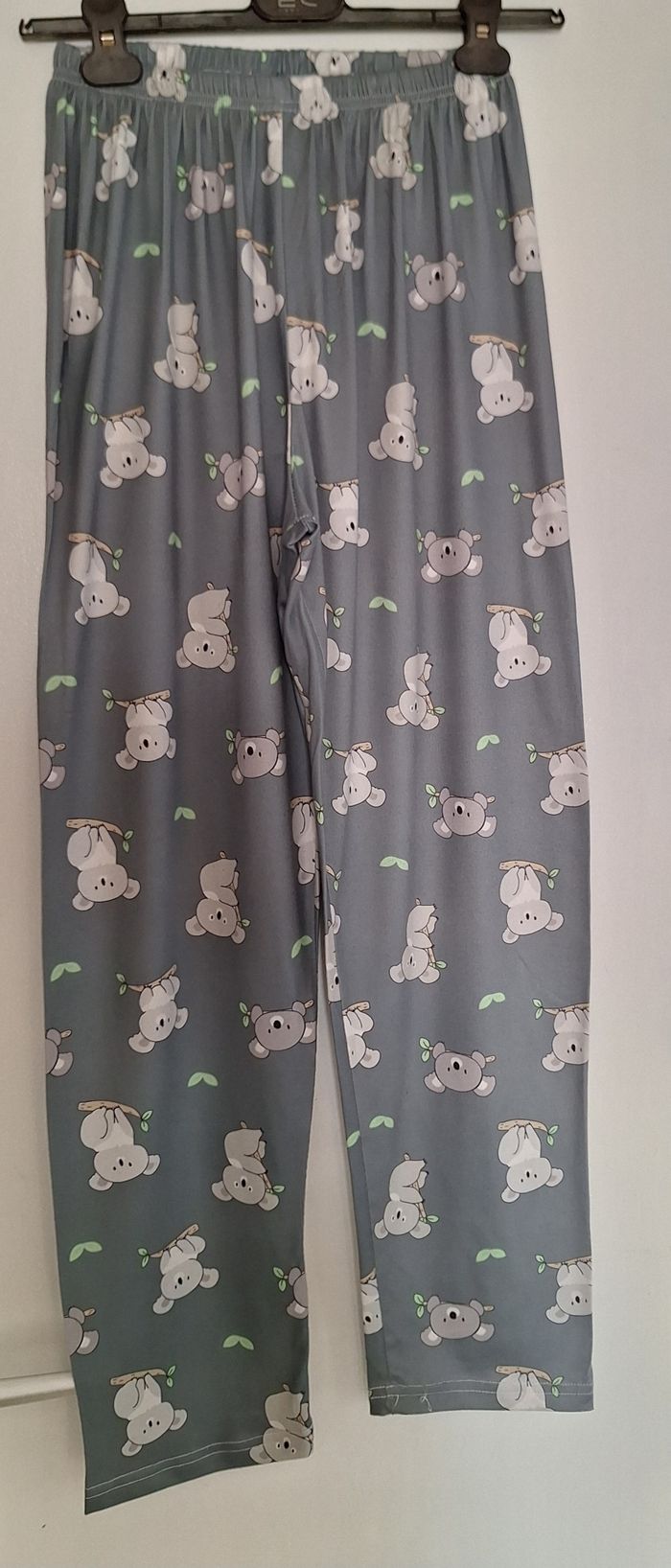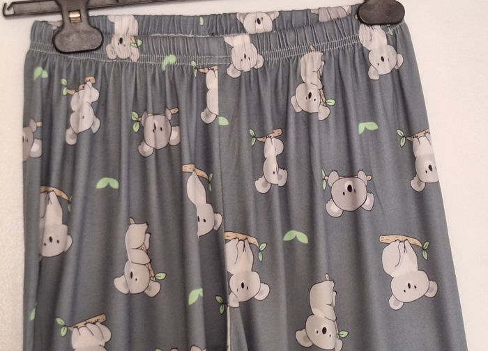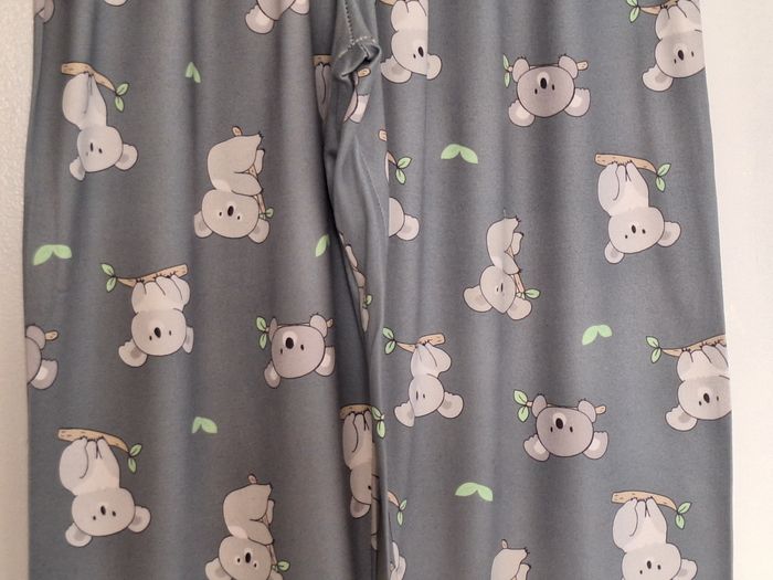 Pantalon de pyjama kaki, imprimé devant et derrière de koalas gris. Taille élastiquée. Tissu fin et léger.