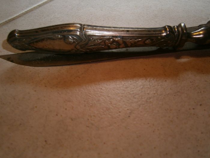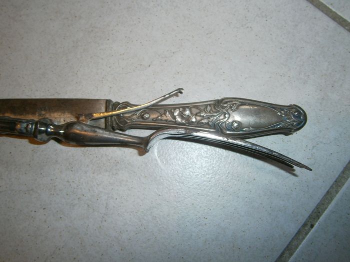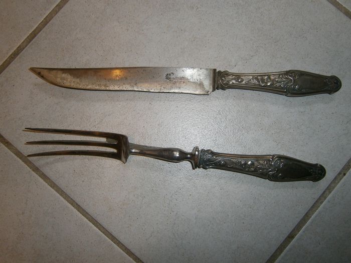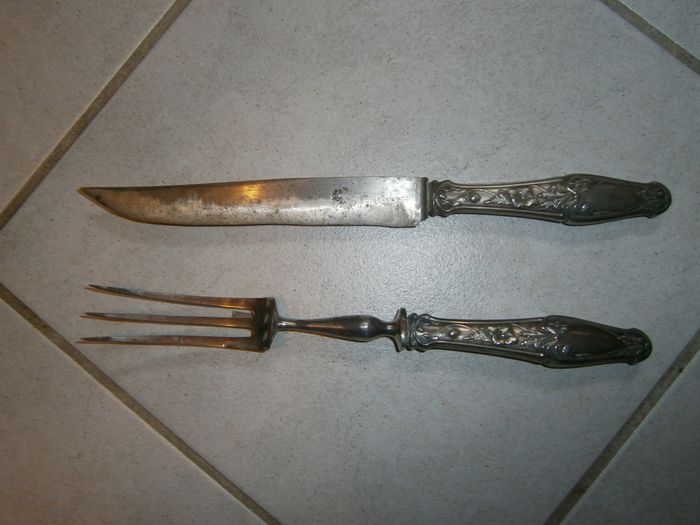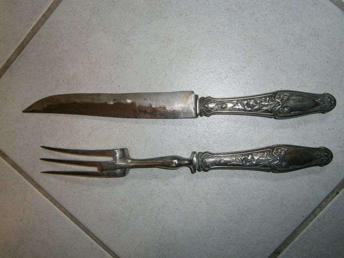 Lot de couverts anciens. Lot de découpe, composé de : - 1 fourchette avec 3 dents et une tige de pose amovible au dos, de 26 cm de long. - 1 couteau de 28 cm de long. Couleur argenté. Manches ciselés. Ont besoin d'être nettoyés et brossés.