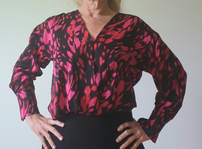 Blouse à manches longues, plus longue à l'arrière. Beau tissu imprimé aux couleurs lumineuses, aspect légèrement satiné. Taille S, mais plutôt 38-40. En parfait état.