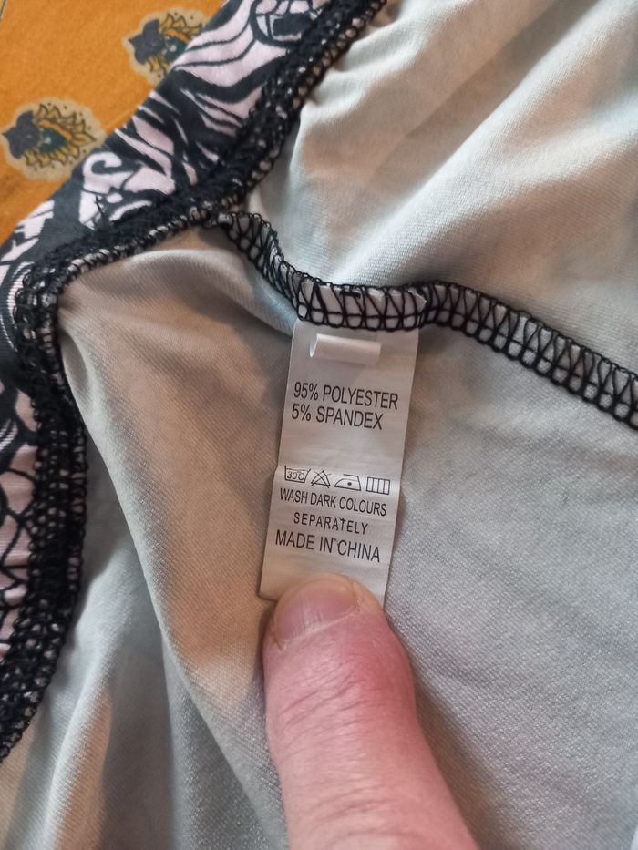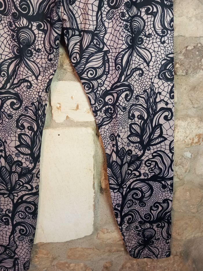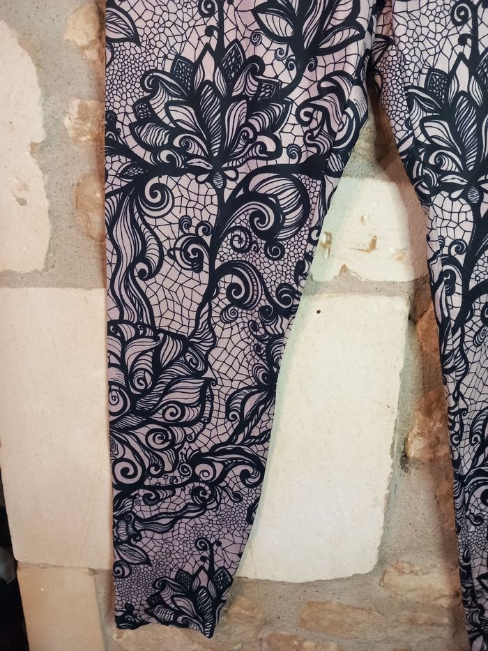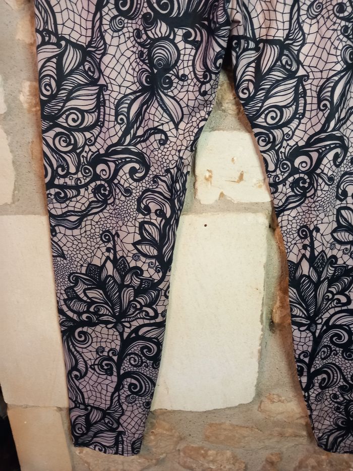 Pantalon confortable couleur beige à motifs noirs. Il a un élastique à la taille. Matière lycra. Taille XL. Longueur totale 97 cm.