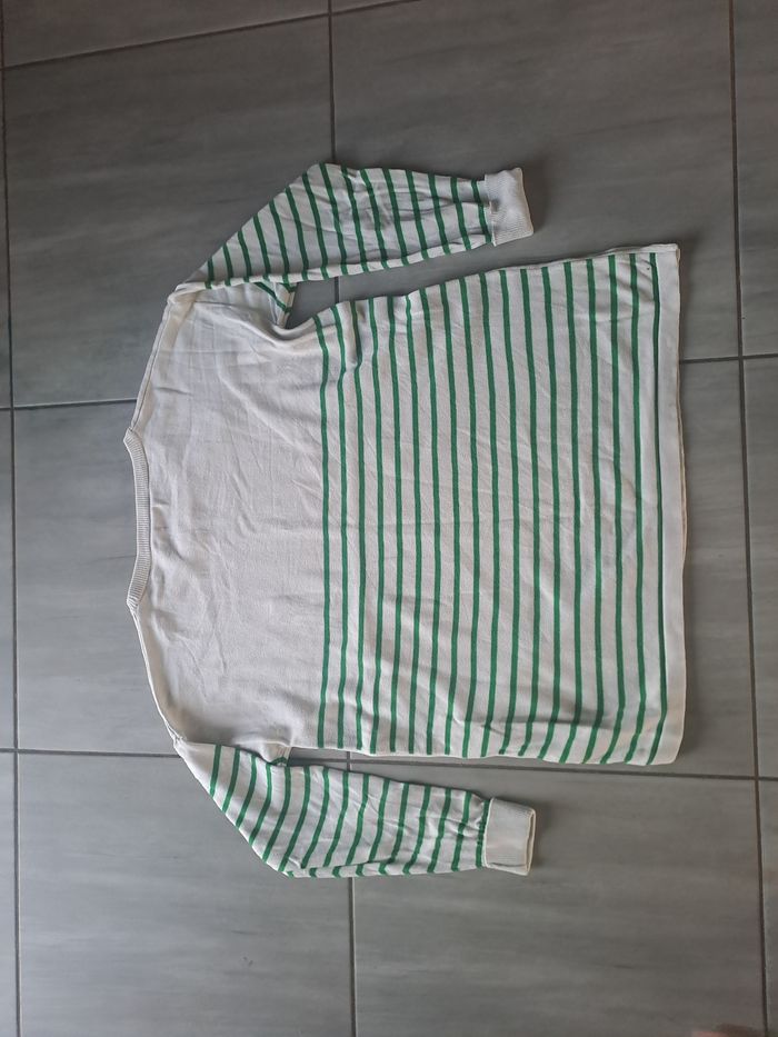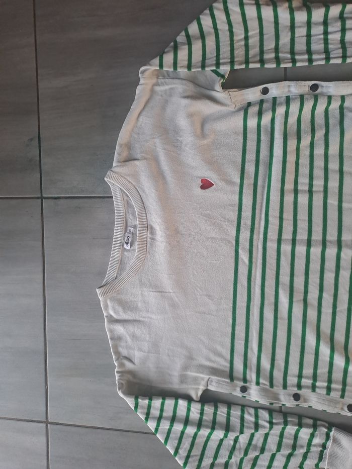Pull de grossesse Pratique également pour l'allaitement Grâce aux boutons pression sur les 2 côtés Manches longues Col rond Couleur Blanc à rayures verte avec un cœur rouge au niveau poitrine gauche Taille XL (42) Marque Gemo